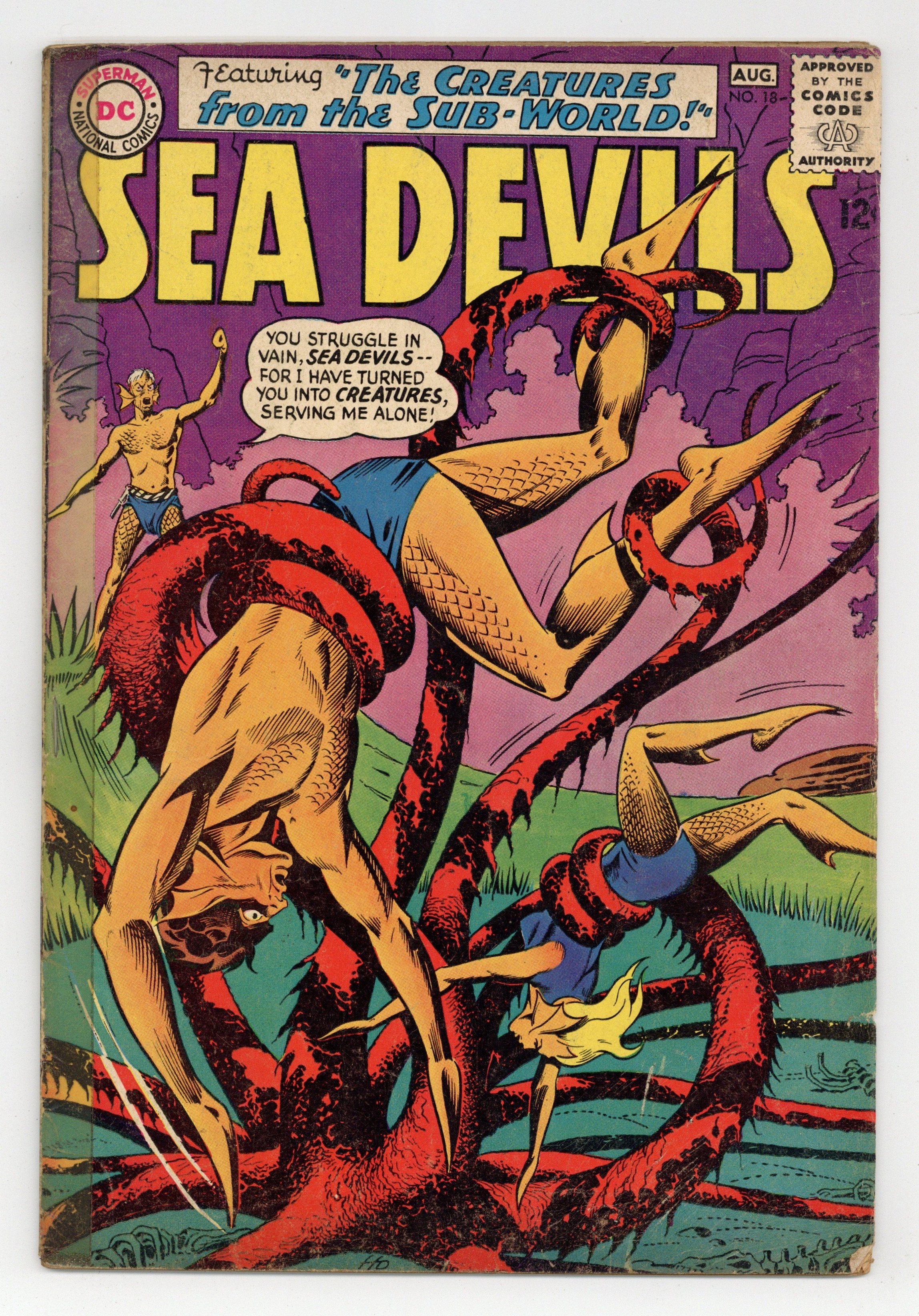 Written by unknown. Art by Howard Purcell and Sheldon Moldoff. Cover by Howard Purcell. The Sea Devils in a book-length thriller told in three parts: "The Creatures from the Sub-World"; "Part 2: The Sea Devil Creatures"; and "Part 3: The Doom of the Crusher Plant"! Plus: untitled Marine Almanac! 1-pager, reprinted from GI Combat (1952) #69; 1-page public service announcement "Learn from Your Hobbies!" by Jack Schiff and Sheldon Moldoff; untitled The Magic Genie half-pager by Henry Boltinoff; and untitled Shorty 1-pager by Henry Boltinoff, reprinted from Detective Comics (1937 1st Series) #189. 32 pages, full color. Cover price $0.12.