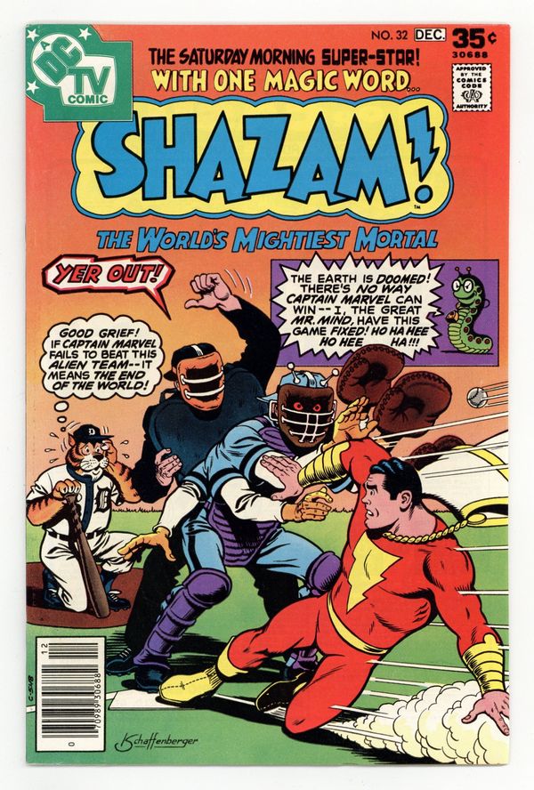 $12.00Cover by Kurt Schaffenberger. Mr. Tawny's Big Game, script by E. Nelson Bridwell, art by Tenny Henson and Bob Smith; Mr. Mind and his team of alien baseball players challenge the Detroit Tigers to a game with the Earth going the winner; Things look bad until Shazam joins the Tigers for the last inning. Hostess Twinkies ad with Wonder Woman, art by Curt Swan and Vince Colletta. 36 pgs., full color. $0.35. Cover price $0.35.