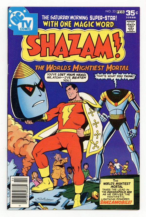 $7.20Cover by Kurt Schaffenberger. The World's Mightiest Race, script by E. Nelson Bridwell, art by Tenny Henson, Vince Colletta, and Kurt Schaffenberger; Mr. Mind turns Mr. Atom into a radioactive race car and challenges Shazam to race him at the Indianapolis 500. Hostess fruit pies ad with the Penguin, art by Curt Swan and Vince Colletta. 36 pgs., full color. $0.35. Cover price $0.35.