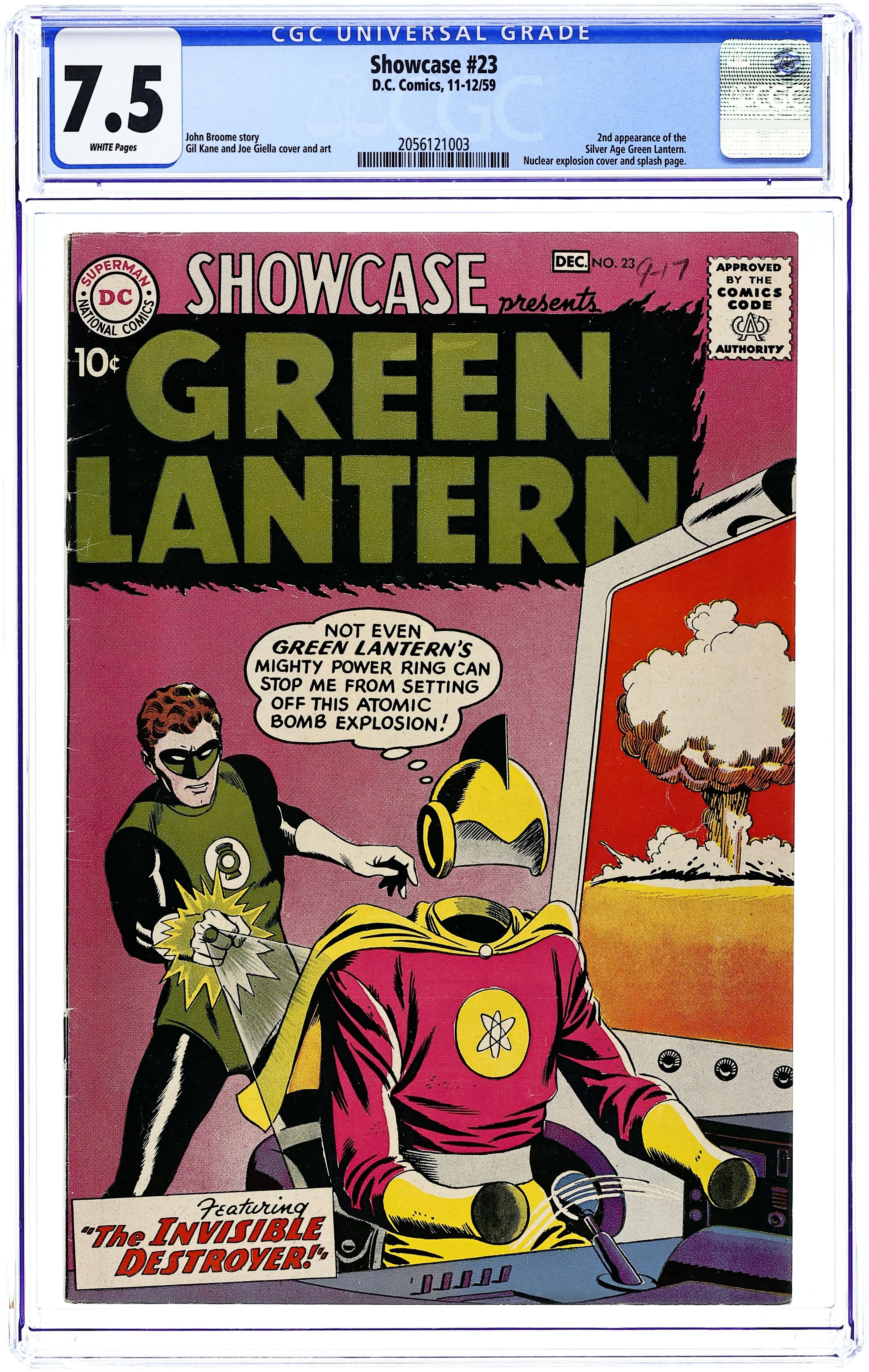2nd appearance of Green Lantern. Cover and interior pencils by Gil Kane, cover and interior inks by Joe Giella. Summons from Space!; Green Lantern travels to Venus to save a blue-skinned caveman-like race from attack by yellow Pterodactyl-like creatures. The Invisible Destroyer!; When Dr. Phillips is distracted, The Invisible Destroyer is released from his mind. Scripts by John Broome. 36 Pages, Full Color. Cover price $0.10.