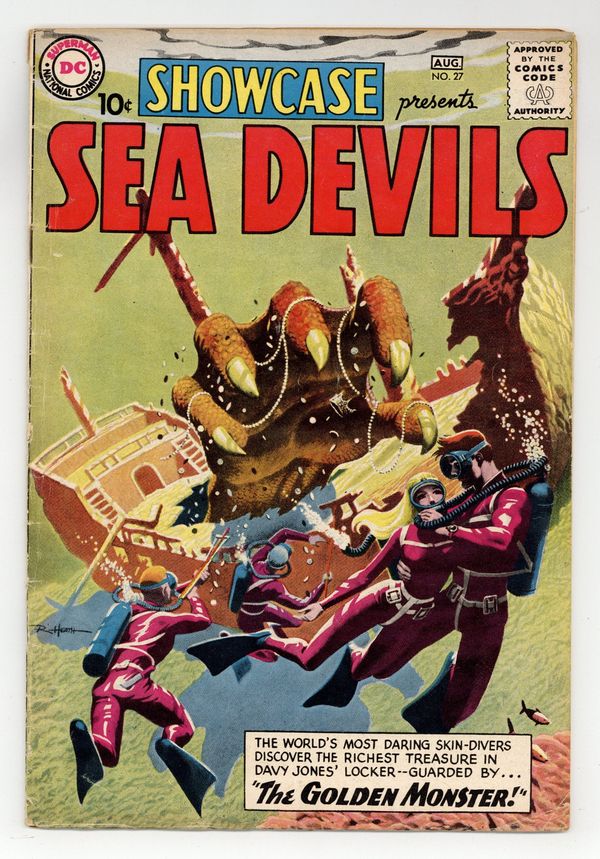 Cover art by Russ Heath. 1st appearance of Sea Devils in The Golden Monster!, script by Robert Kanigher, art by Russ Heath; SCUBA diver Dane Dorrance hopes to earn his Dad's UDT flippers; Judy Walton hopes to land the lead in the movie "Sea Devils"; Biff Bailey hopes to prove he's not a "clumsy ox"; Nicky Walton hopes to prove he's a man. The A-B-Seas of Skin Diving!, script by Robert Kanigher, pencils by Ross Andru, inks by Mike Esposito; Information on scuba diving, equipment, mysteries and joys; And "Never dive alone!" Monsters of the Seven Seas! article. Ad for The Many Loves of Dobie Gillis, art by Bob Oksner. 36 Pages, Full Color. Cover price $0.10.