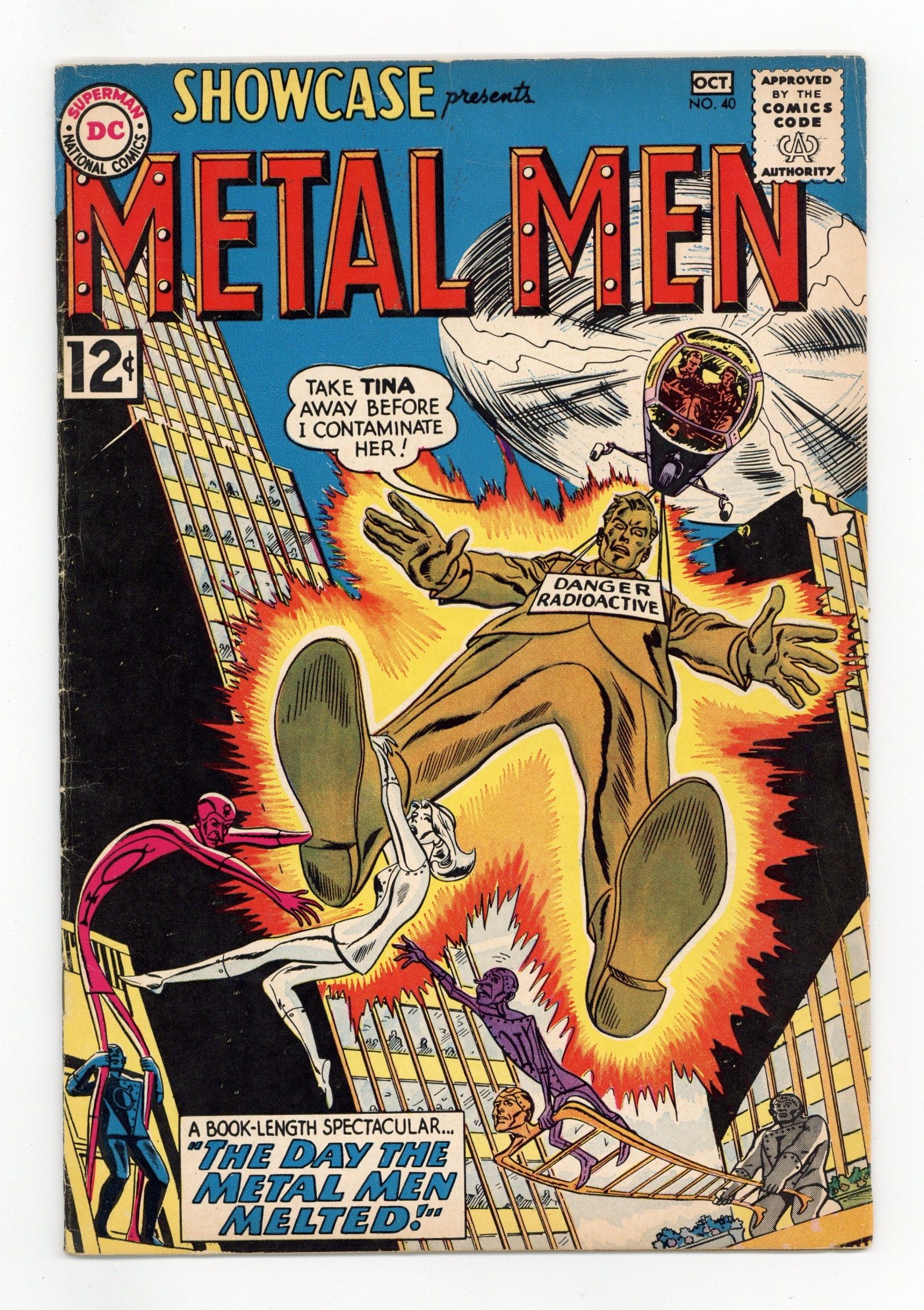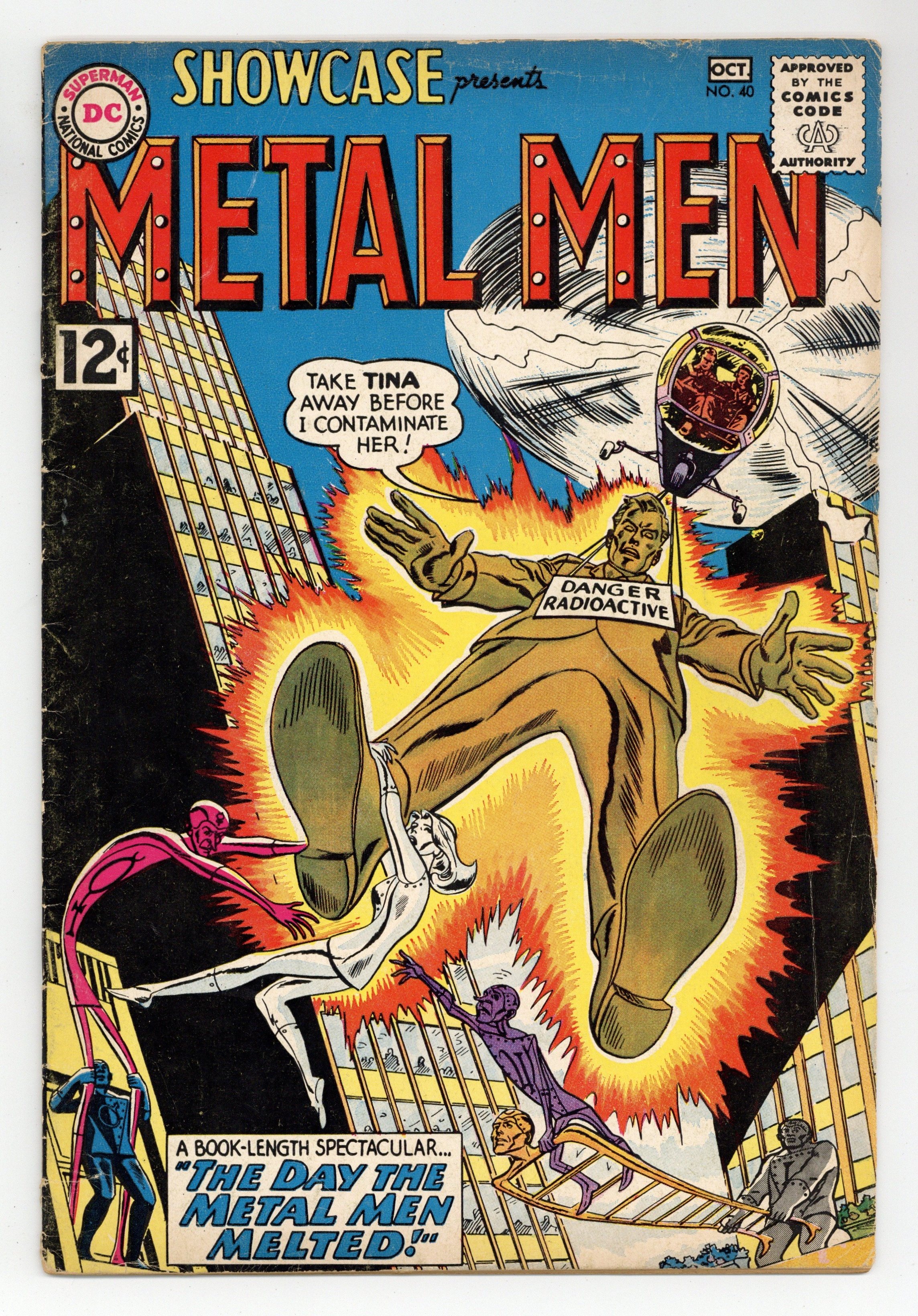 4th appearance of the Metal Men. Cover pencils by Ross Andru, inks by Mike Esposito. The Day the Metal Men Melted!, script by Robert Kanigher, pencils by Ross Andru, inks by Mike Esposito; The Metal Men battle Chemo after he turns Doc Magnus into a radioactive giant. Continued in Metal Men #1. 36 Pages, Full Color. Cover price $0.12.