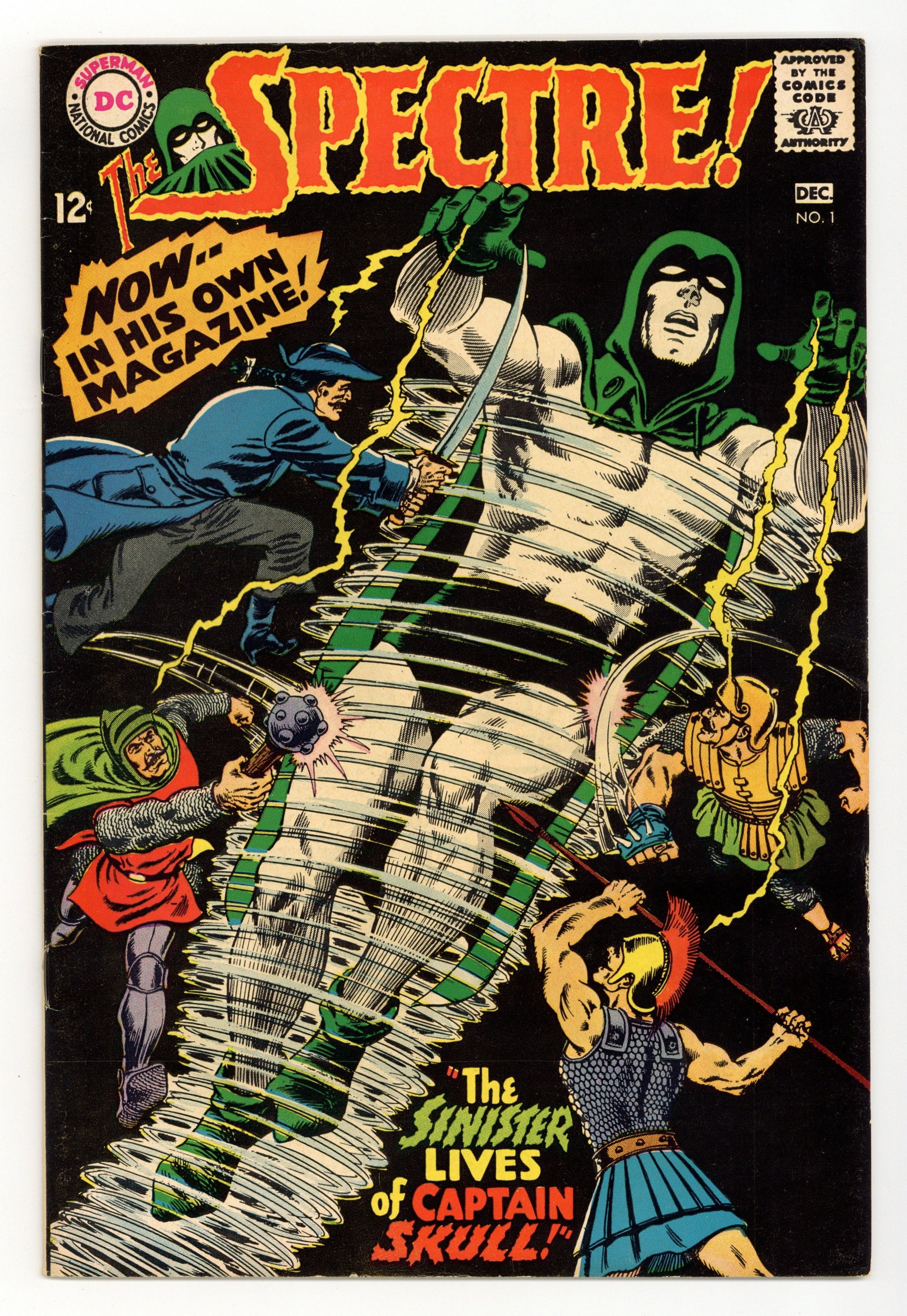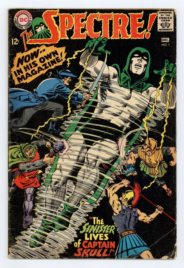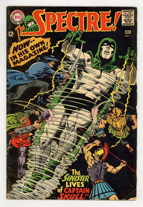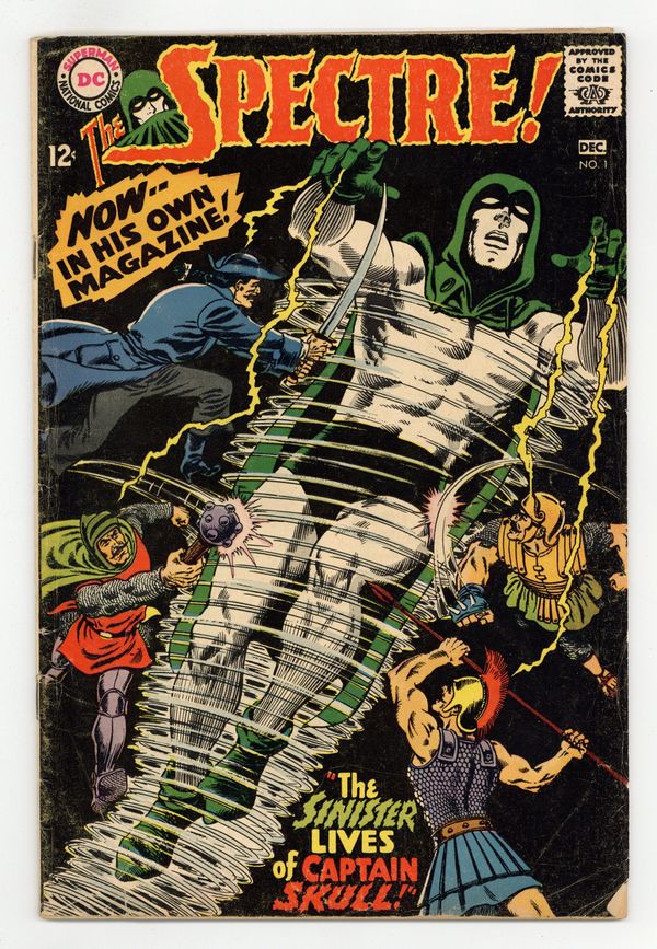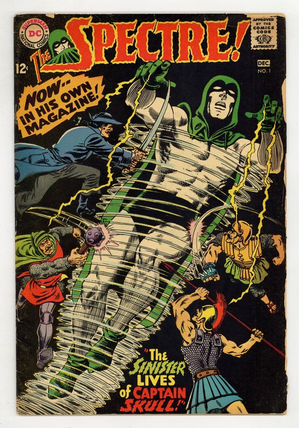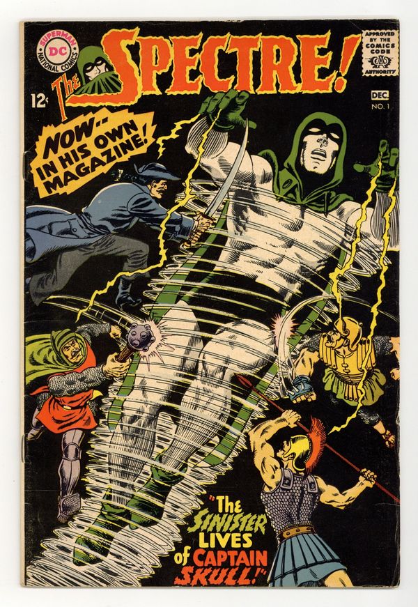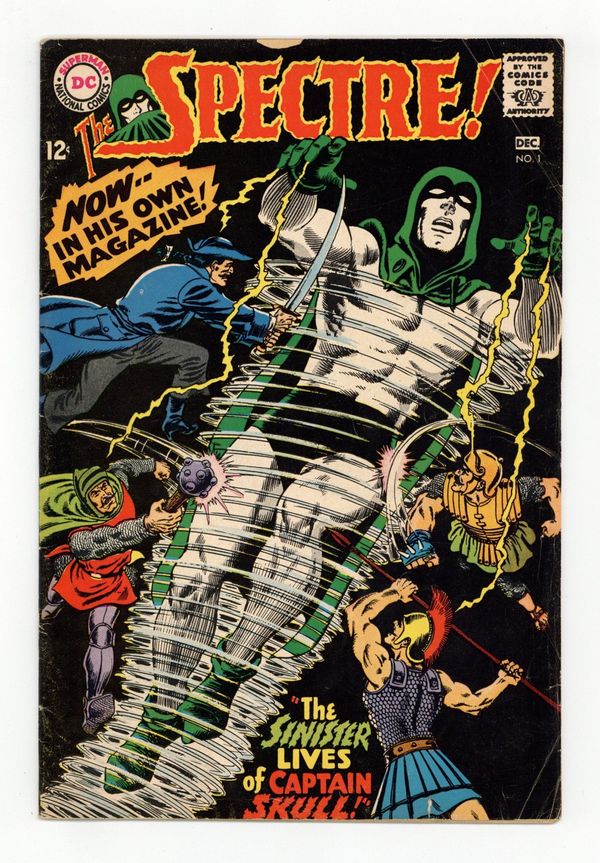 Written by Gardner Fox. Art and cover by Murphy Anderson. The use of an experimental anesthetic on a sniper-shot ambassador causes him to be possessed by his ancestor, an 18th century pirate named Captain Skull who has received strong supernatural powers in the process. Only the Spectre can stand against him. 36 pages, full color. $0.12. Cover price $0.12.