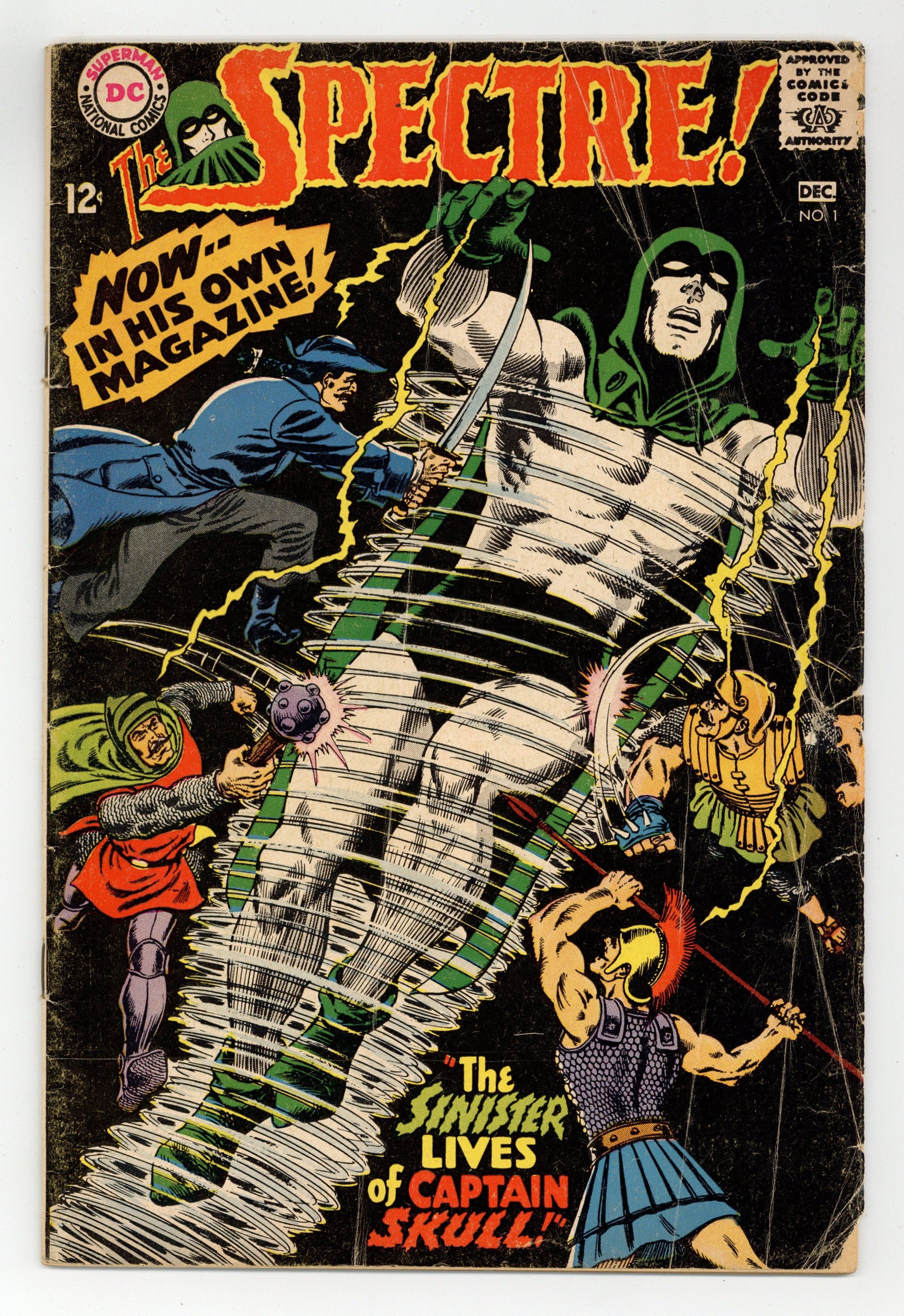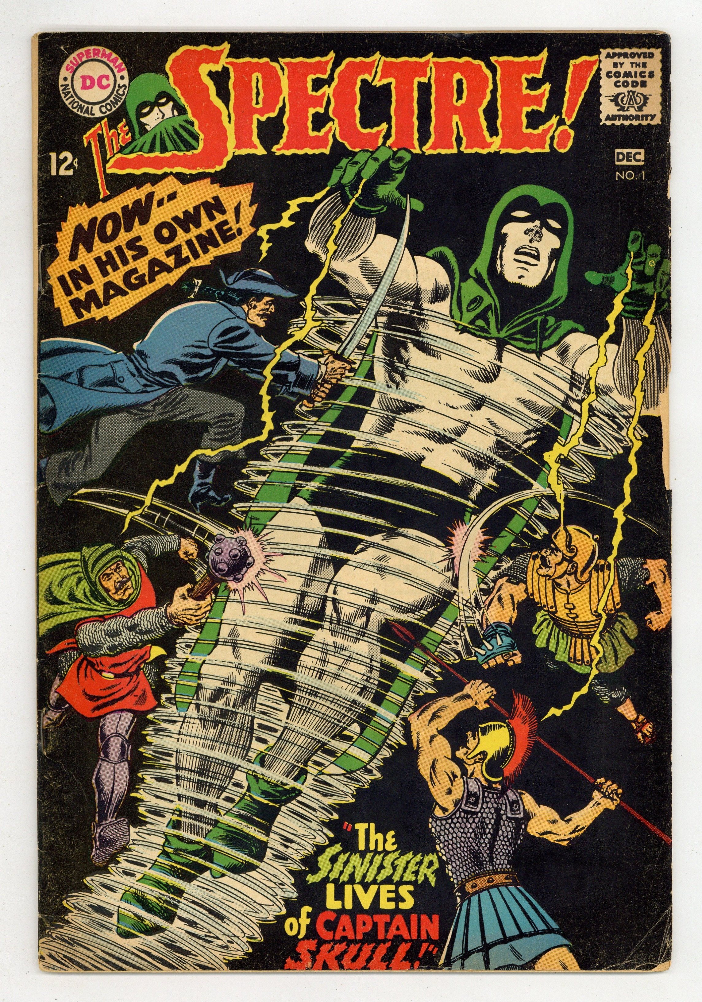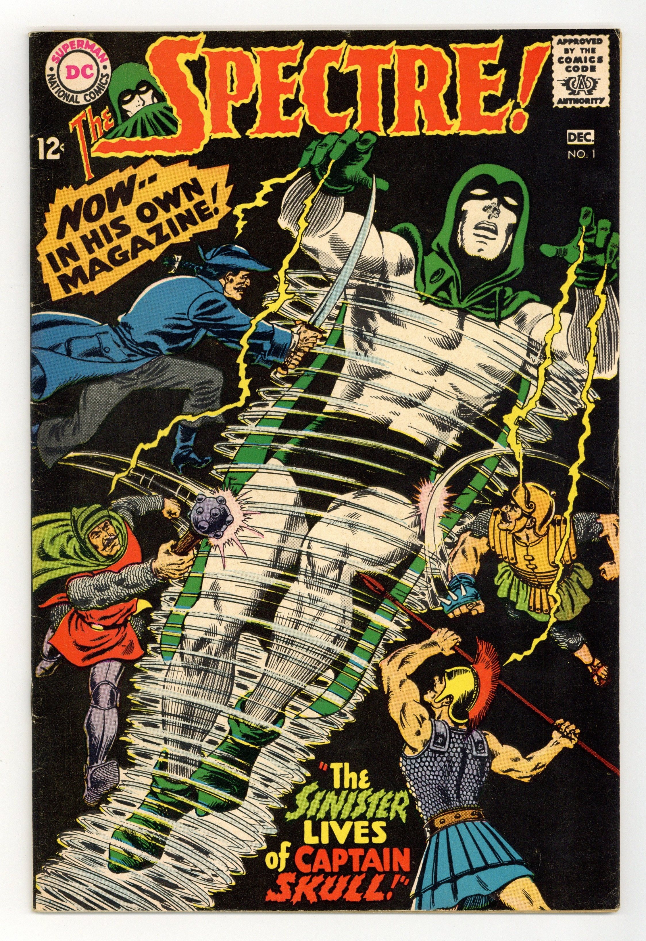Written by Gardner Fox. Art and cover by Murphy Anderson. The use of an experimental anesthetic on a sniper-shot ambassador causes him to be possessed by his ancestor, an 18th century pirate named Captain Skull who has received strong supernatural powers in the process. Only the Spectre can stand against him. 36 pages, full color. $0.12. Cover price $0.12.