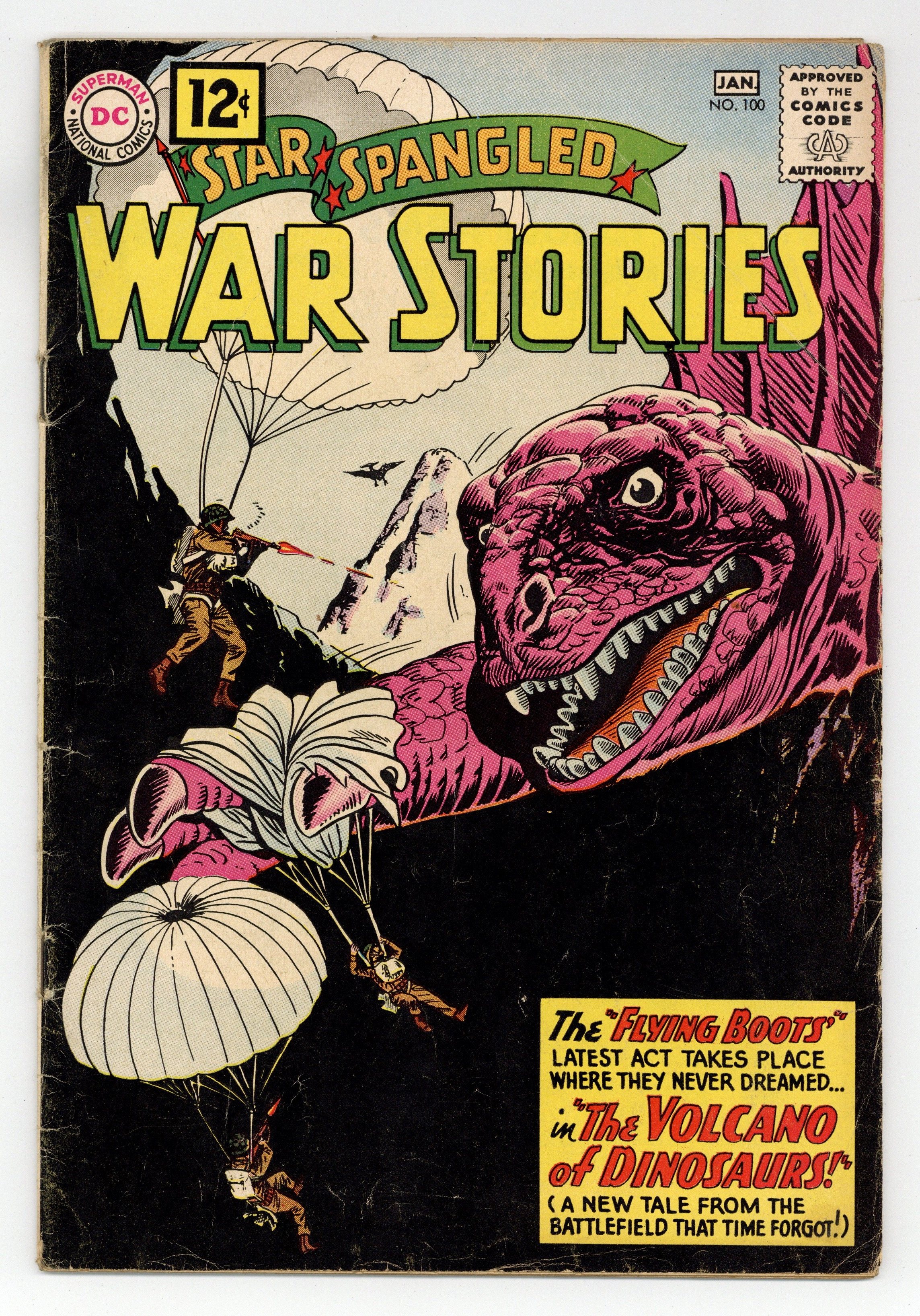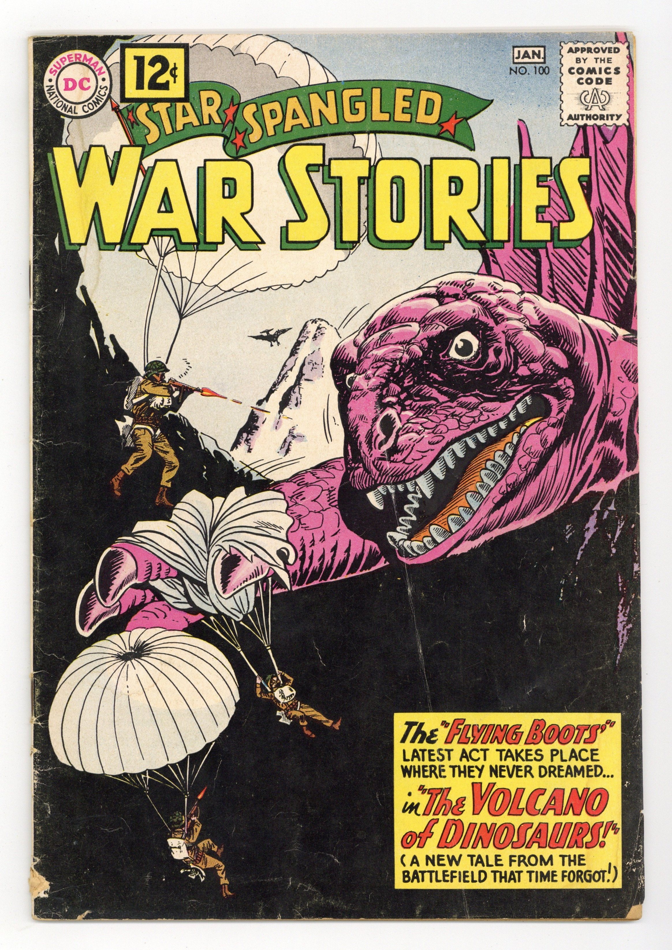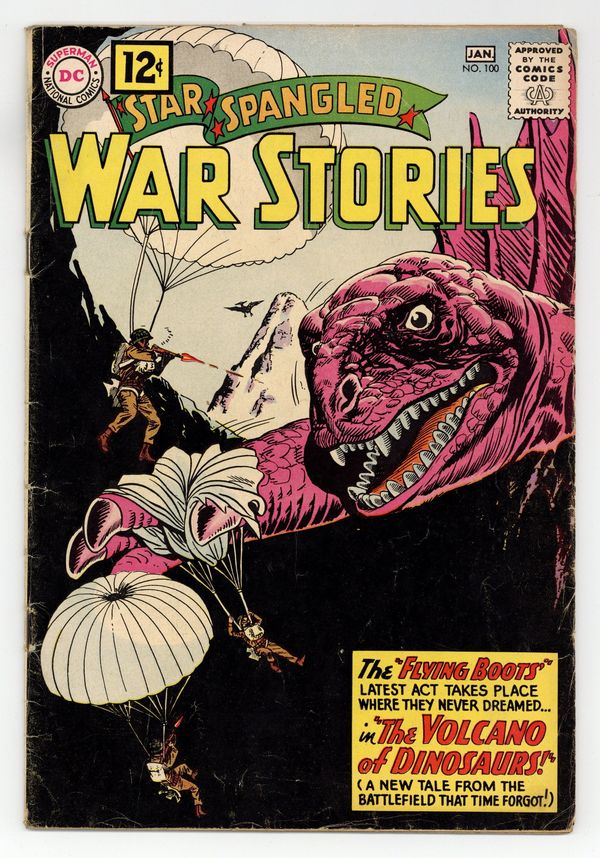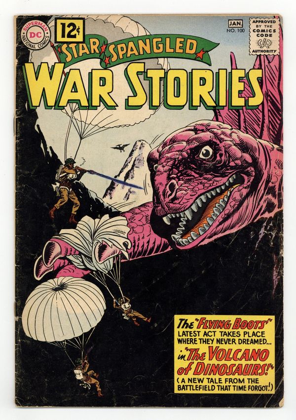Cover pencils by Ross Andru, inks by Mike Esposito. The Volcano of Monsters featuring War That Time Forgot with the Flying Franks, script by Robert Kanigher, pencils by Ross Andru, inks by Mike Esposito. The Flippers of Doom, script by Hank Chapman, art by Jack Abel. Attack and Conquer WWII Battle Story of the 8th Air Fighter Group, script and pencils by Morris Waldinger, inks by Tom Nicolisi. Stragglers Never Come Back, script by Hank Chapman, art by Jack Abel. 36 Pages, Full Color. Cover price $0.12.