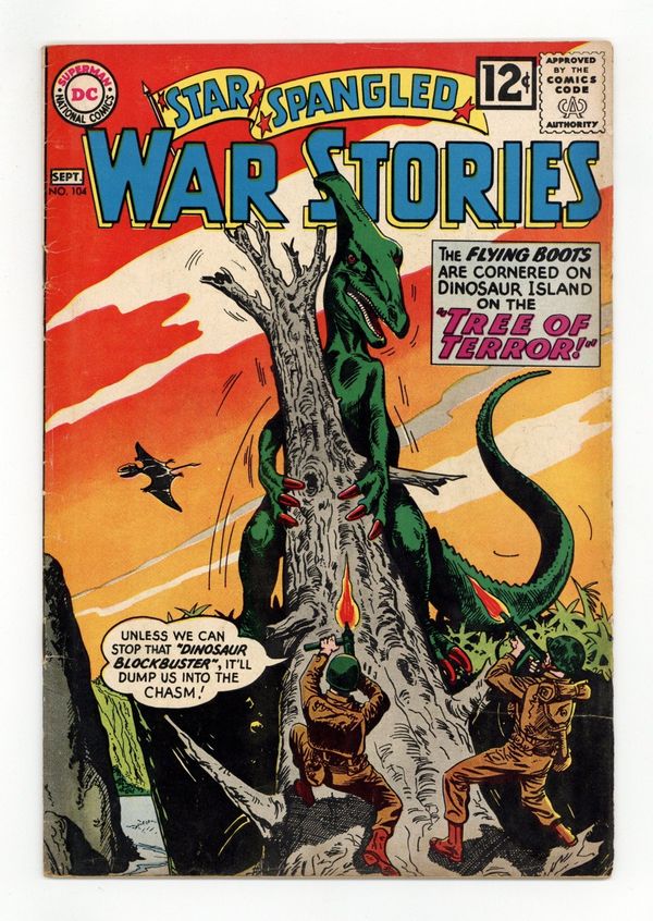 Dinosaur issue. Cover pencils by Ross Andru, inks by Mike Esposito. The Tree of Terror featuring The War That Time Forgot with The Flying Boots/Franks, script by Robert Kanigher, pencils by Ross Andru, inks by Mike Esposito. The Silent Tin Can, script by Bob Haney, art by Jack Abel. Sink That Tank, art by Jack Abel. Army Slang filler half-page, script and pencils by Morris Waldinger, inks by Tom Nicolisi. 36 Pages, Full Color. Cover price $0.12.