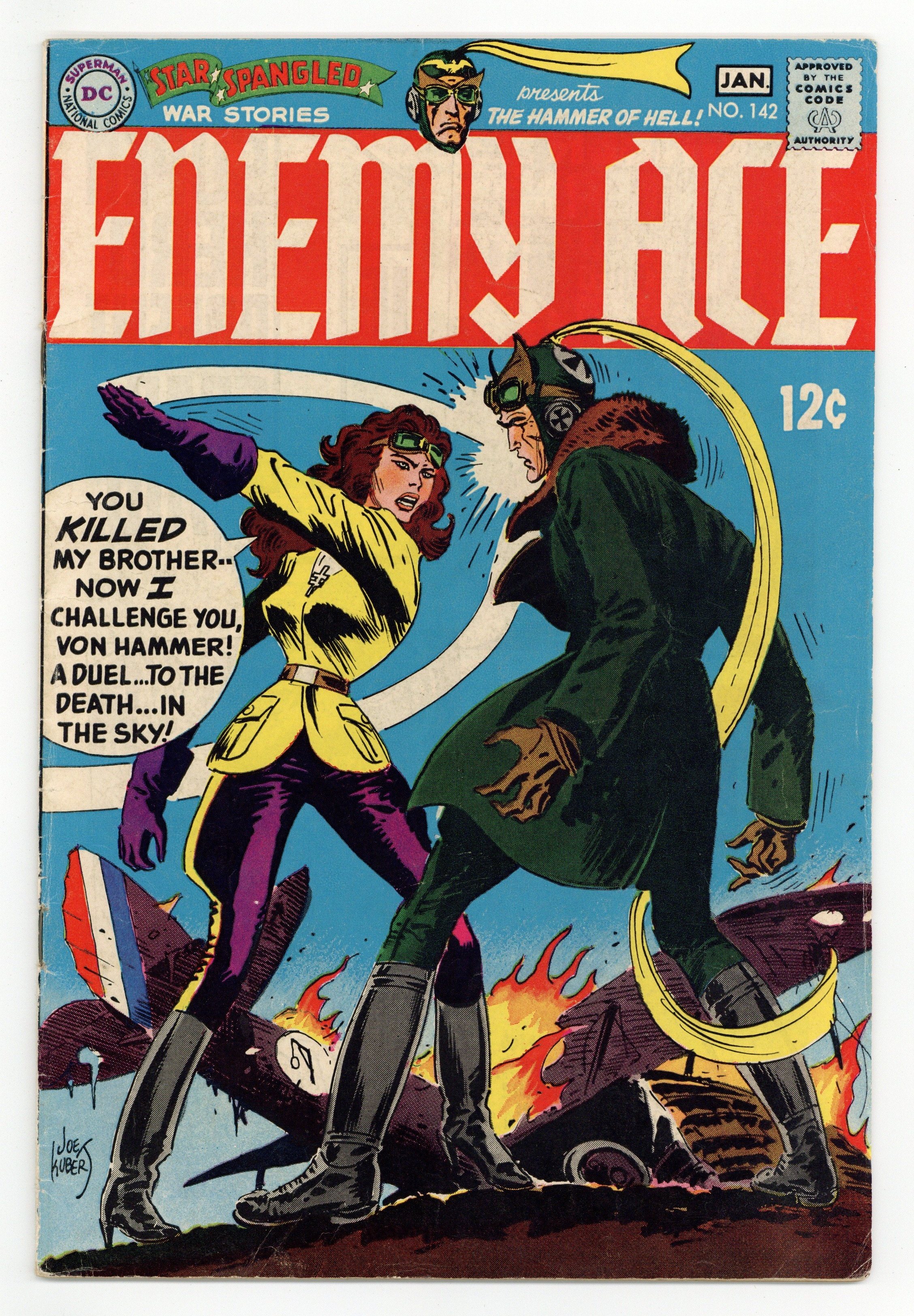 $16.00Cover art by Joe Kubert. Ad for Green Lantern #65 and The Brave and the Bold #81, pencils by Mike Sekowsky and Neal Adams, inks by Joe Giella and Neal Adams. Vengeance is a Harpy! starring Enemy Ace, script by Robert Kanigher, art by Joe Kubert; When von Hammer shoots down The Hangman, his sister Denise takes to the skies in an attempt to seek revenge. Captain Action and Action Boy Meet Dr. Evil toy ad, art by Kurt Schaffenberger. Ad for Superman #212, pencils by Curt Swan, inks by Mike Esposito. 36 Pages, Full Color. Cover price $0.12.