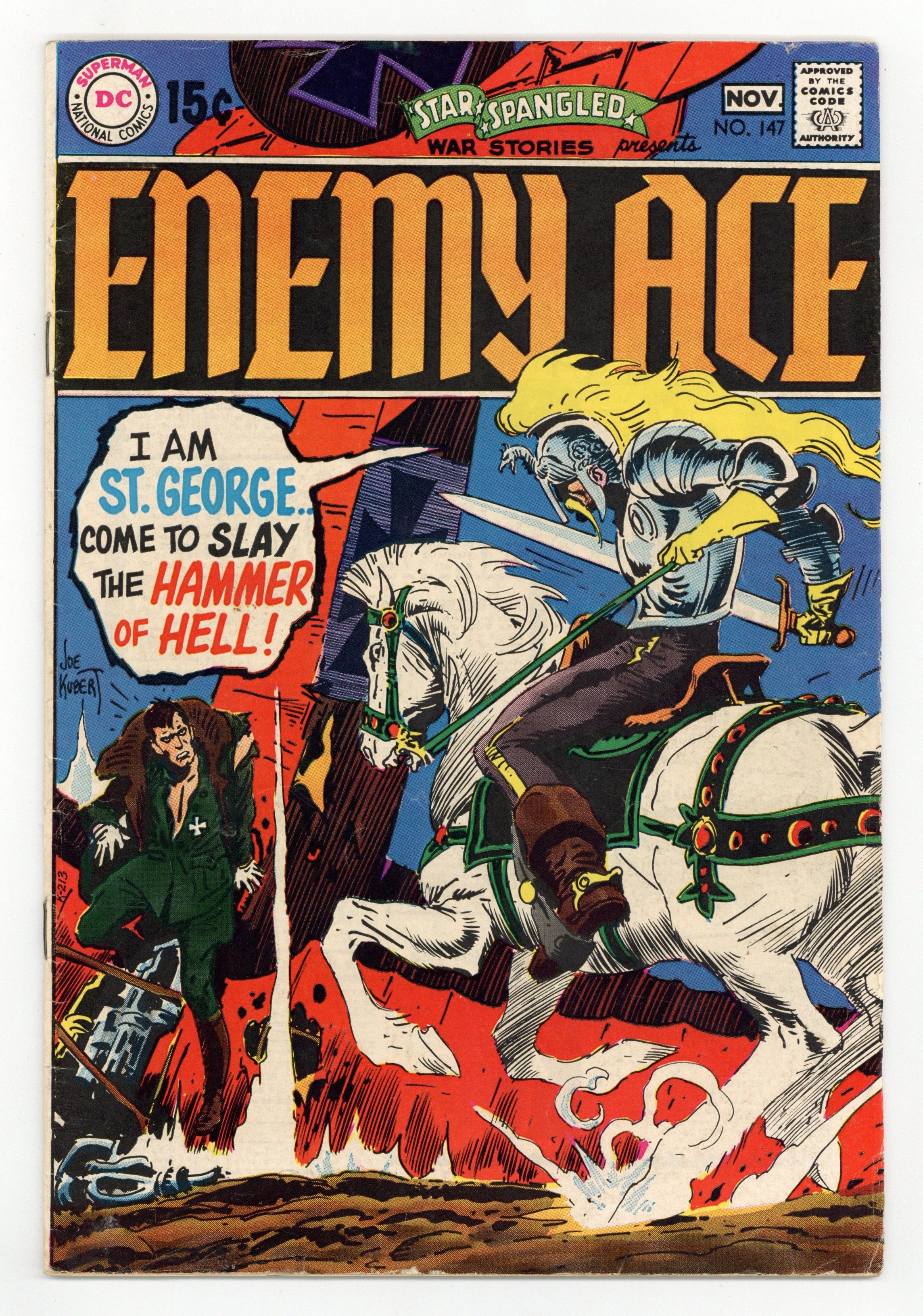 Cover art by Joe Kubert. A Grave in the Sky! starring Enemy Ace, script by Robert Kanigher, art by Joe Kubert; St. George attempts to slay the dragon that terrorizes England... the Enemy Ace! Ad for DC Special #5 [The Secret Lives of Joe Kubert], art by Joe Kubert. Ad for World's Finest Comics #188, pencils by Curt Swan, inks by Murphy Anderson. 36 Pages, Full Color. Cover price $0.15.