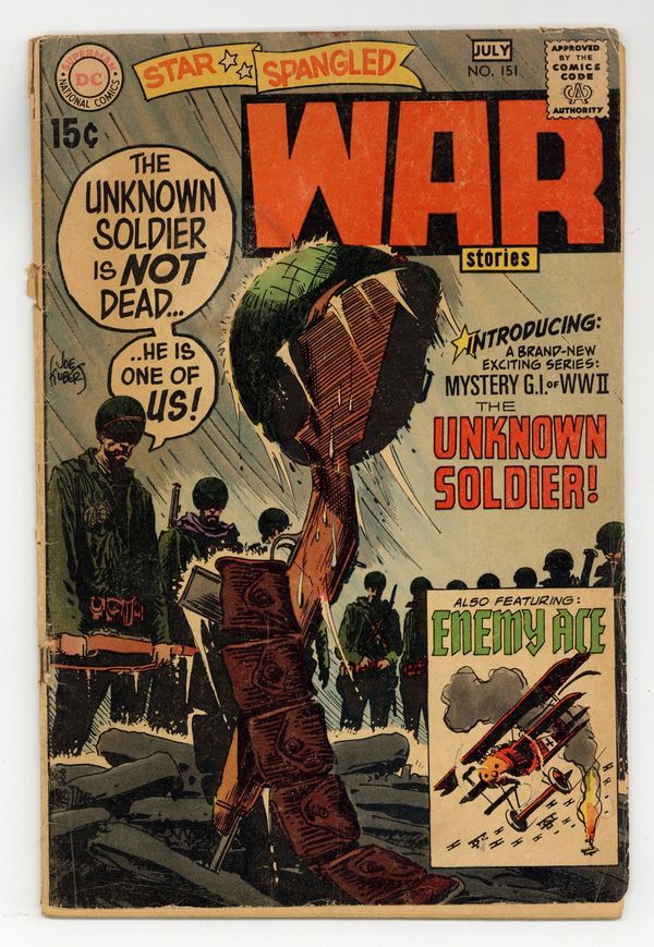 Ends Apr 15 7:54 PM CST Bid History 8 bids Current Bid $260 Your Secret Max Bid If you'd like to bid, please log in or register. Cover art by Joe Kubert. They Came from Shangri-La! starring Unknown, script and art by by Joe Kubert; The Unknown Soldier is a master of disguise who follows his family heritage by taking on whatever role is required to win the next battle. Ad for Showcase #91, pencils by Mike Sekowsky, inks by Dick Giordano. Flaming Bait! starring Enemy Ace, script by Robert Kanigher, art by Joe Kubert; Hans Von Hammer must deal with the death of two of his pilots after they posed for pictures before flying their missions. Ad for G. I. Combat #142, art by Joe Kubert. 36 Pages, Full Color. Cover price $0.15.