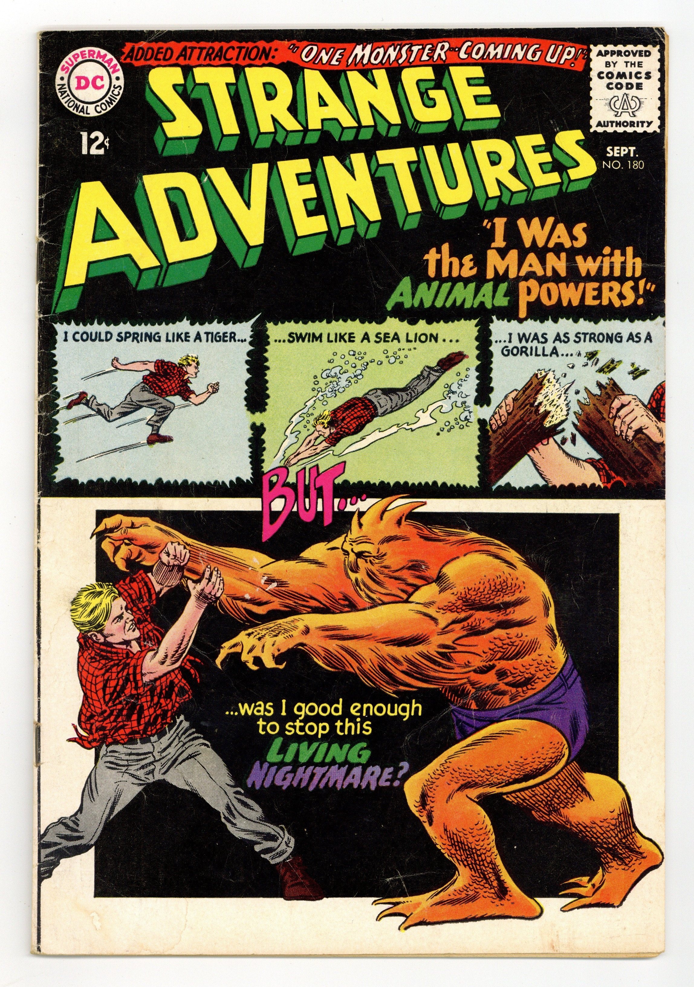 1st appearance and origin of Animal Man in "I Was the Man With Animal Powers" (pencils by Carmine Infantino); and "One Monster, Coming Up." Infantino/Murphy Anderson cover.Carmine Infantino cover. Carmine Infantino & George Roussos art. 36 Pages, Full Color. Cover price $0.12.