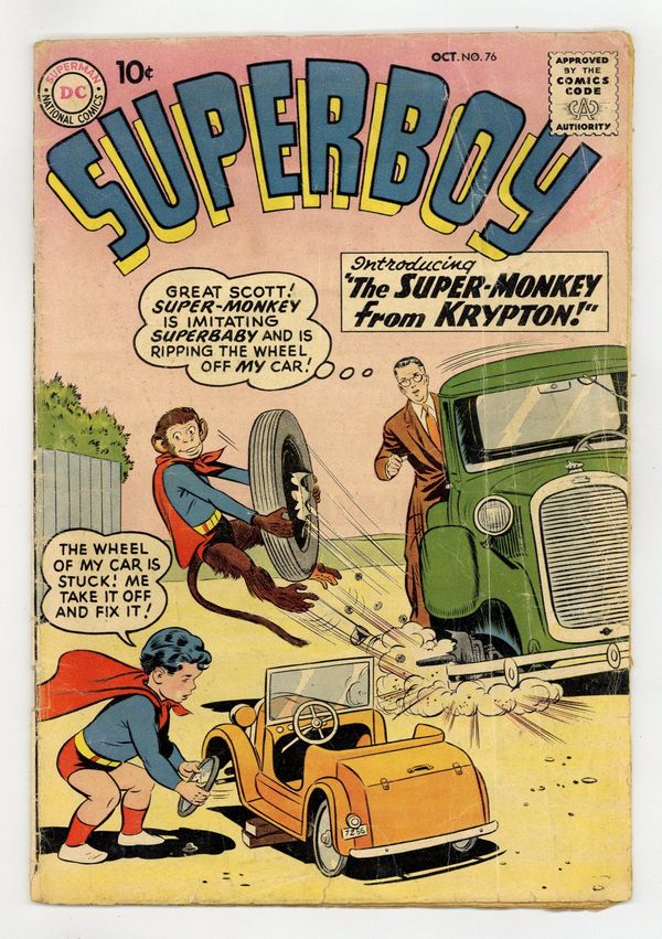 Cover pencils by Curt Swan, inks by Stan Kaye. The Super-Monkey from Krypton! starring Superboy, Beppo the Super-Monkey (introduction, origin), Superbaby, Martha Kent, and Jonathan Kent, script by Otto Binder, art by George Papp. Shorty humor page by Henry Boltinoff. The Biggest Bully in Smallville!, script by Alvin Schwartz, art by John Sikela; The Kents allowed a hardened juvenile delinquent to move in hoping they can reform him. The Day Clark Kent Got a Haircut!, script by Robert Bernstein, art by John Sikela; Smallville's barber wonders why he's never given Clark Kent a haircut. 36 Pages, Full Color. Cover price $0.10.