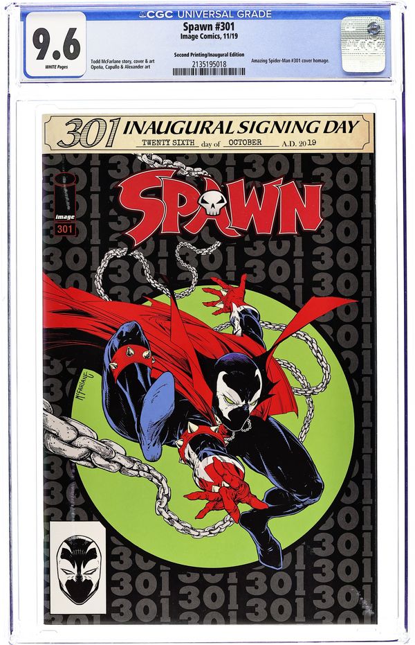 Alamo Draft House Inaugural Signing Day Exclusive cover by Todd McFarlane. Written by Todd McFarlane. Art by Todd McFarlane, Greg Capullo, Jason Shawn Alexander, Clayton Crain and Jerome Opena. TODD McFARLANE returns to pencil and ink SPAWN #301-with GREG CAPULLO, JASON SHAWN ALEXANDER, CLAYTON CRAIN, JEROME OPEÑA, and FRANCESCO MATTINA, and even more surprises to come in the record-breaking, longest-running creator-owned comic book in history! 48 pages, full color.
