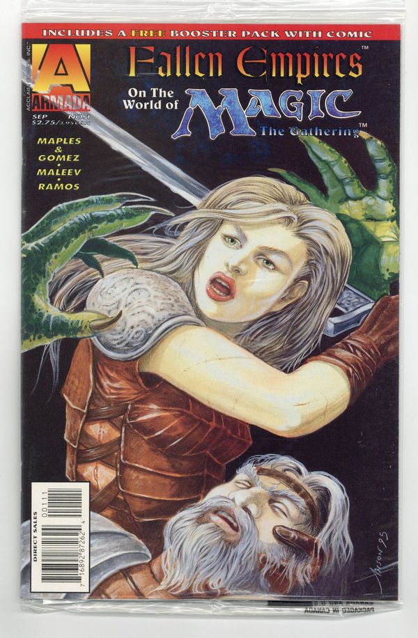 Published Sep 1995 by Acclaim/Armada.$16.00Direct Edition. This book comes polybagged with a 8 card pack of MTG: Fallen Empires "Rumors of War" - This 2-part mini-series focuses on the events hinted at in Wizards of the Coast's Fallen Empire cards. All the drama and tragedy caused by the coming ice age will be dramatically told by the editorial team that brought you the hit Shadow Mage and Ice Age Armada series. The story takes place between the Urza/Mishra war set forth in Antiquities and the story now being told in Ice Age. The plot is officially sanctioned by Wizards of the Coast and makes an excellent precursor to the Ice Age mini-series now in progress. Written by Jeff Gomez and Kevin Maples, with art by Alex Maleev and Rodney Ramos. Cover by Anson Maddocks. Cover price $2.75.