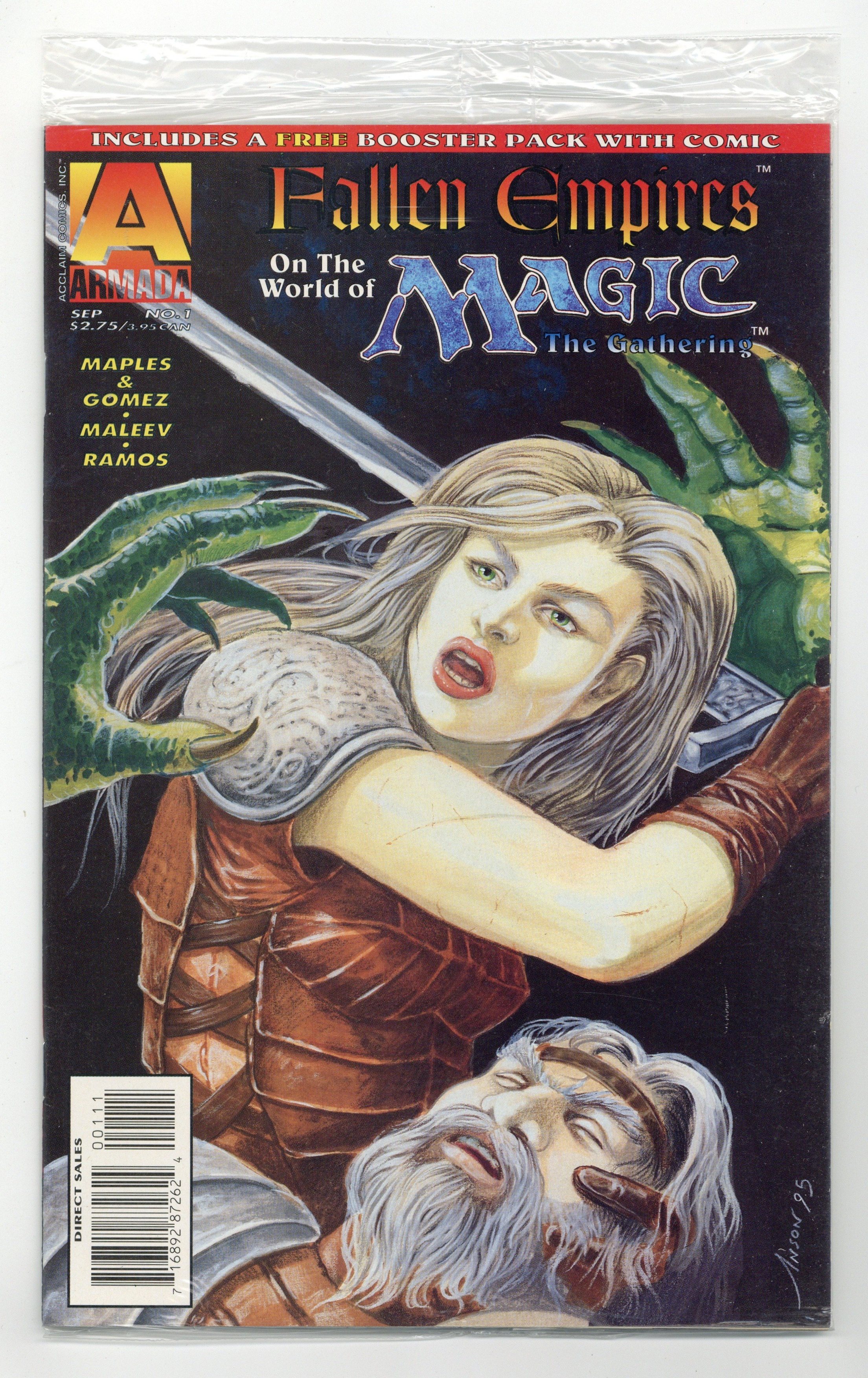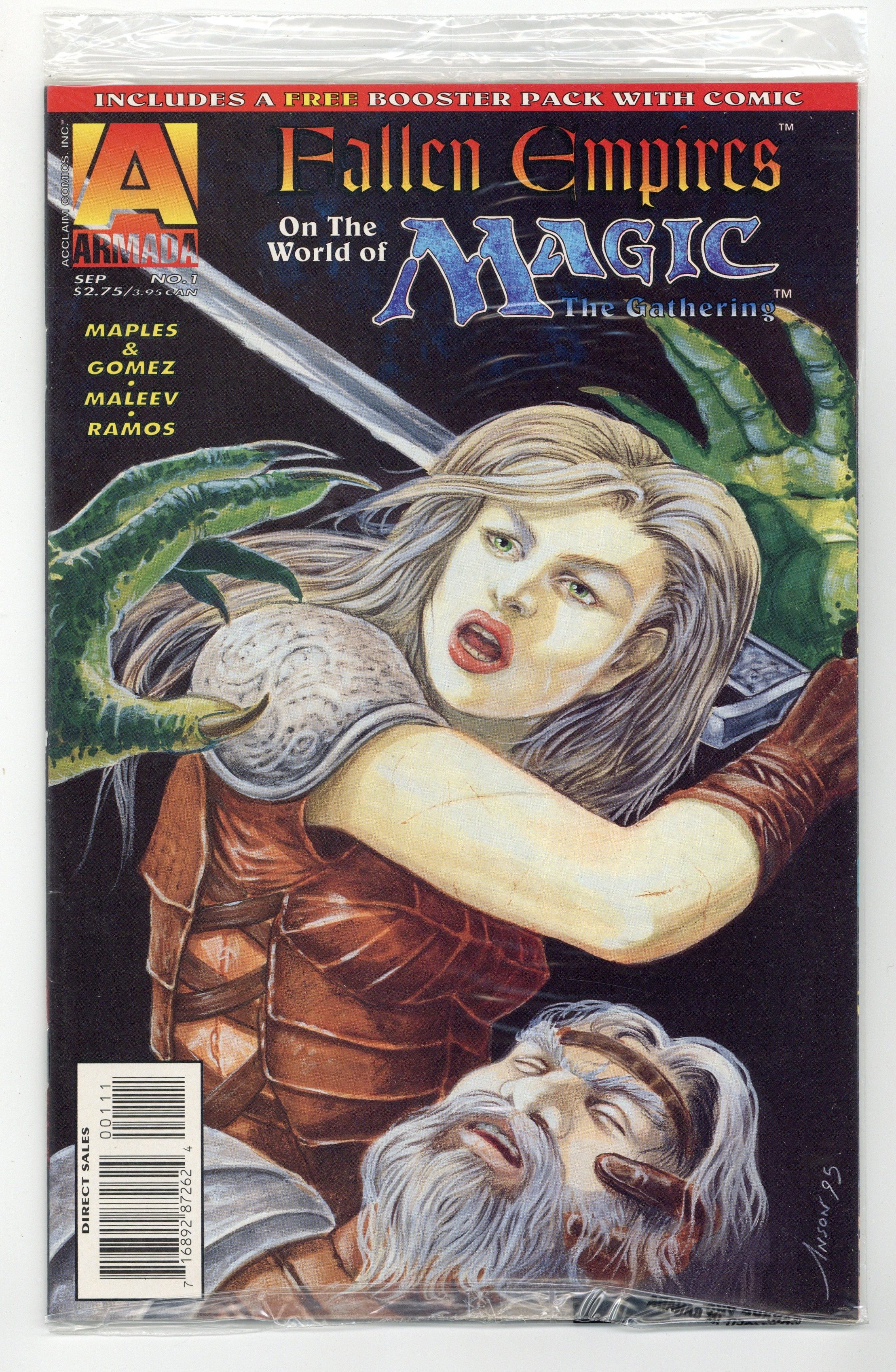 Published Sep 1995 by Acclaim/Armada.$15.00Direct Edition. This book comes polybagged with a 8 card pack of MTG: Fallen Empires "Rumors of War" - This 2-part mini-series focuses on the events hinted at in Wizards of the Coast's Fallen Empire cards. All the drama and tragedy caused by the coming ice age will be dramatically told by the editorial team that brought you the hit Shadow Mage and Ice Age Armada series. The story takes place between the Urza/Mishra war set forth in Antiquities and the story now being told in Ice Age. The plot is officially sanctioned by Wizards of the Coast and makes an excellent precursor to the Ice Age mini-series now in progress. Written by Jeff Gomez and Kevin Maples, with art by Alex Maleev and Rodney Ramos. Cover by Anson Maddocks. Cover price $2.75.
