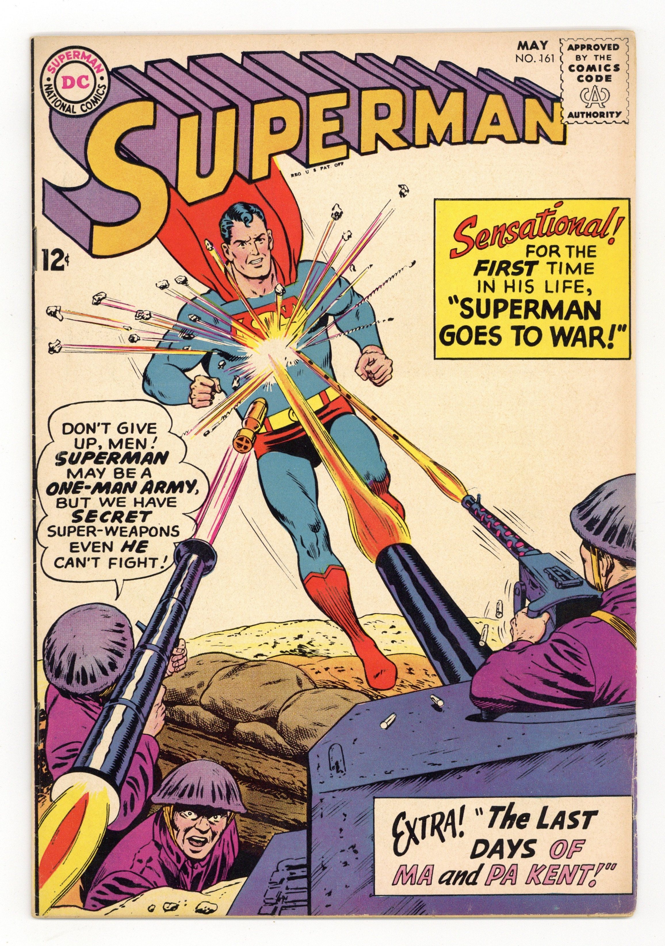 Cover pencils by Curt Swan, inks by George Klein. The Last Days of Ma and Pa Kent!, script by Leo Dorfman, art by Al Plastino; On the anniversary of his adoptive parents' deaths, Superman recalls how he, as Superboy, sent his parents on a Caribbean cruise on which they contracted the fever plague and died. Superman Goes To War! starring Supergirl and the Zhorians, script by Edmond Hamilton, pencils by Curt Swan, inks by George Klein. 36 Pages, Full Color. Cover price $0.12.