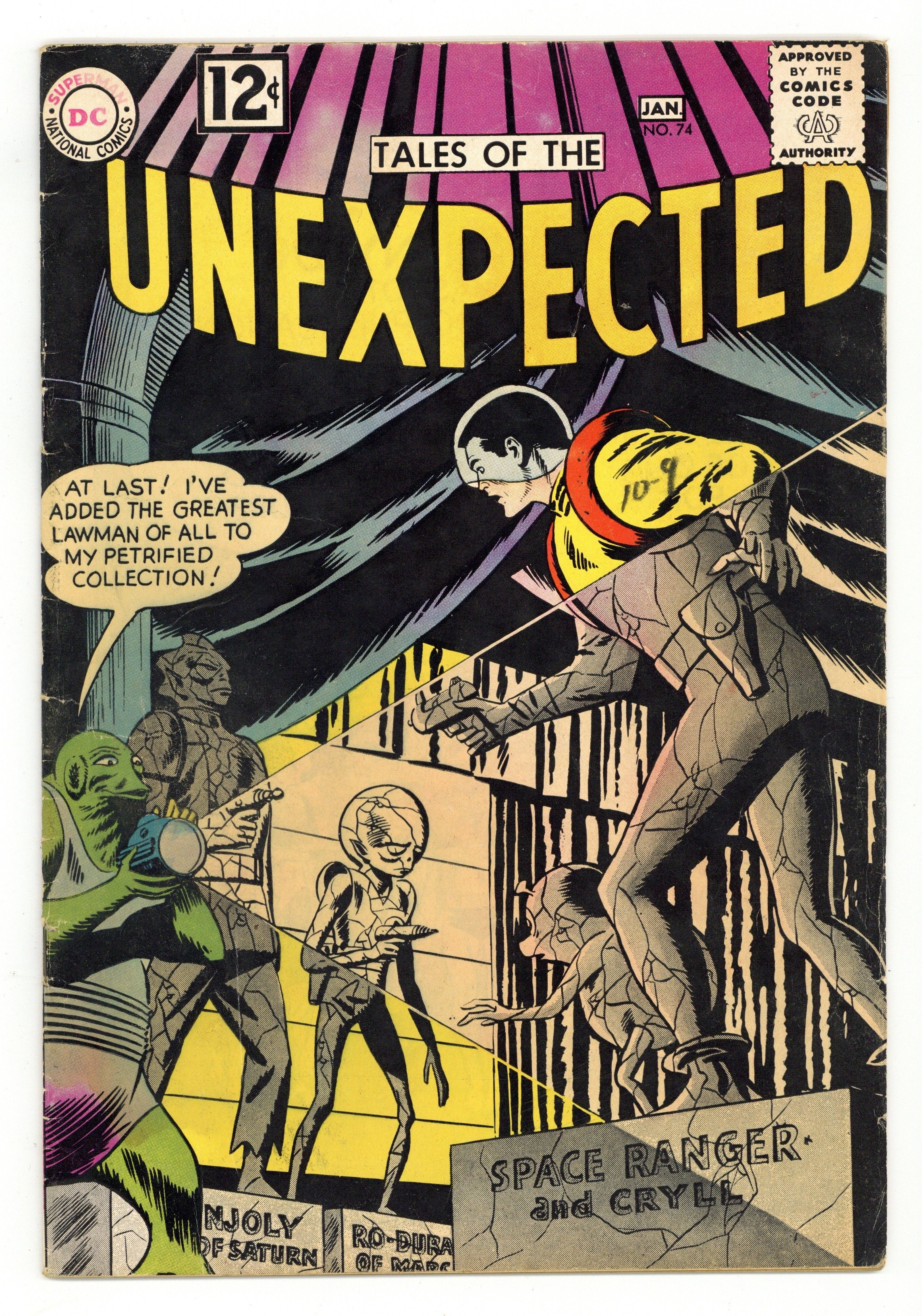 Cover art by Bob Brown. House ad introducing Johnny DC as Superman DC Publications' official mascot. Prison Camp on Asteroid X-3, art by George Roussos. On the Planet Og humor page by Henry Boltinoff. House ad for Showcase #41. Prospector-- In Outer Space! featuring Spaceman-at-Work, art by Sid Greene. Article describing the work of astronomers using observatory telescopes to map the universe. House ad for Aquaman #6 and Rip Hunter #11, art by Nick Cardy and Bill Ely. The Man Who Petrified Heroes, script by Arnold Drake, art by Bob Brown; Space Ranger and Cryll are captured by the evil Darmbua, who plans to turn all his enemies to stone. Pennies for UNICEF!public service announcement, script by Jack Schiff, art by Sheldon Moldoff. 36 Pages, Full Color. Cover price $0.12.