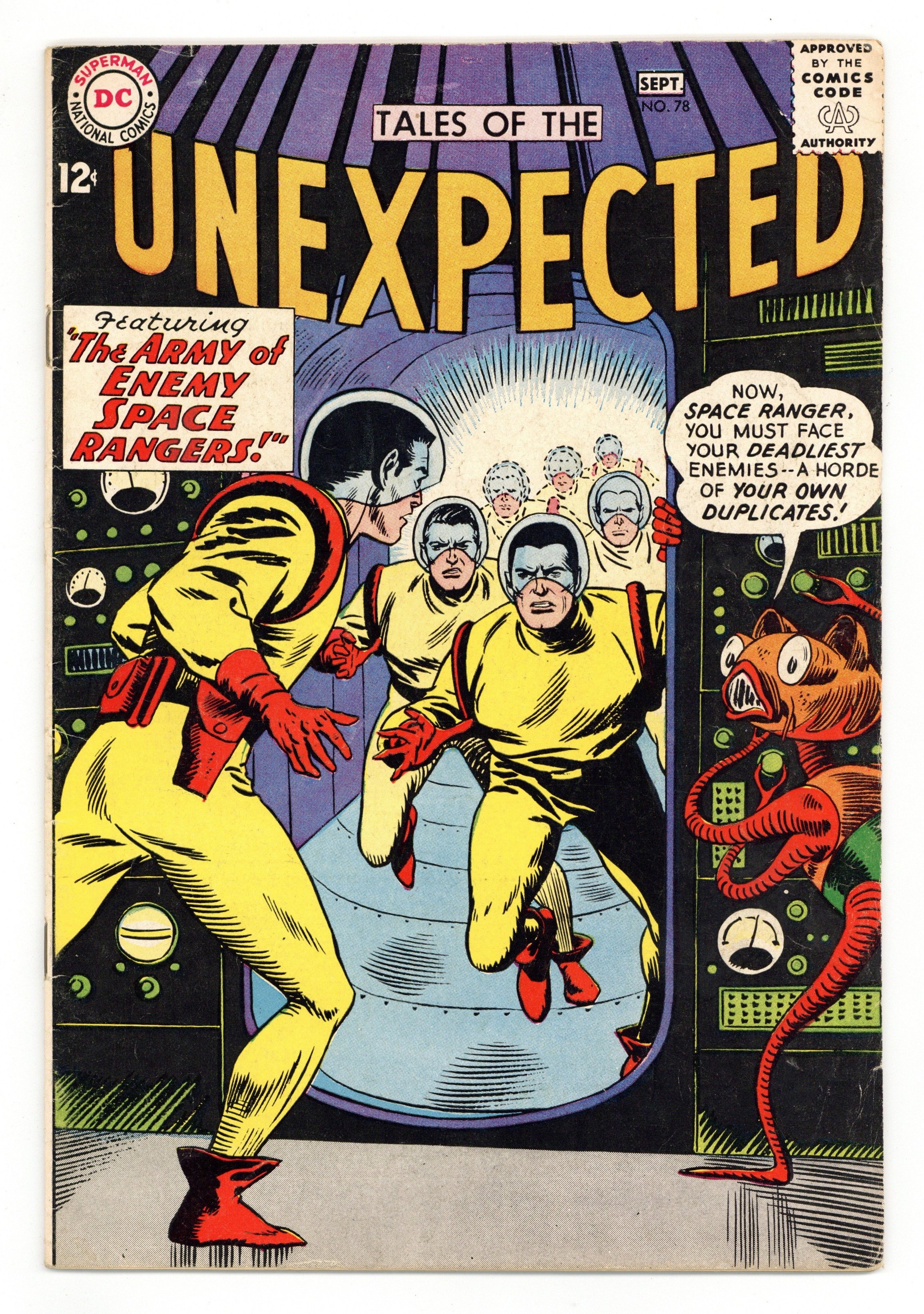 $16.00Cover art by Bob Brown. The Siren of Space, art by George Roussos; Space pilot Harlow Jones is sent to investigate a planetoid where a beautiful girl forces spaceships to crash, like the mythical sirens. House ad for Superman Annual #7, pencils by Curt Swan. House ad for Batman Annual #5, pencils by Sheldon Moldoff and Dick Sprang, inks by Charles Paris and Stan Kaye. The Space Mechanic featuring Spaceman-at-Work, art by Howard Sherman. Mystery of the Cosmic Rays fact page. The Army of Enemy Space Rangers starring Space Ranger, art by Phil Kelsey. 36 Pages, Full Color. Cover price $0.12.