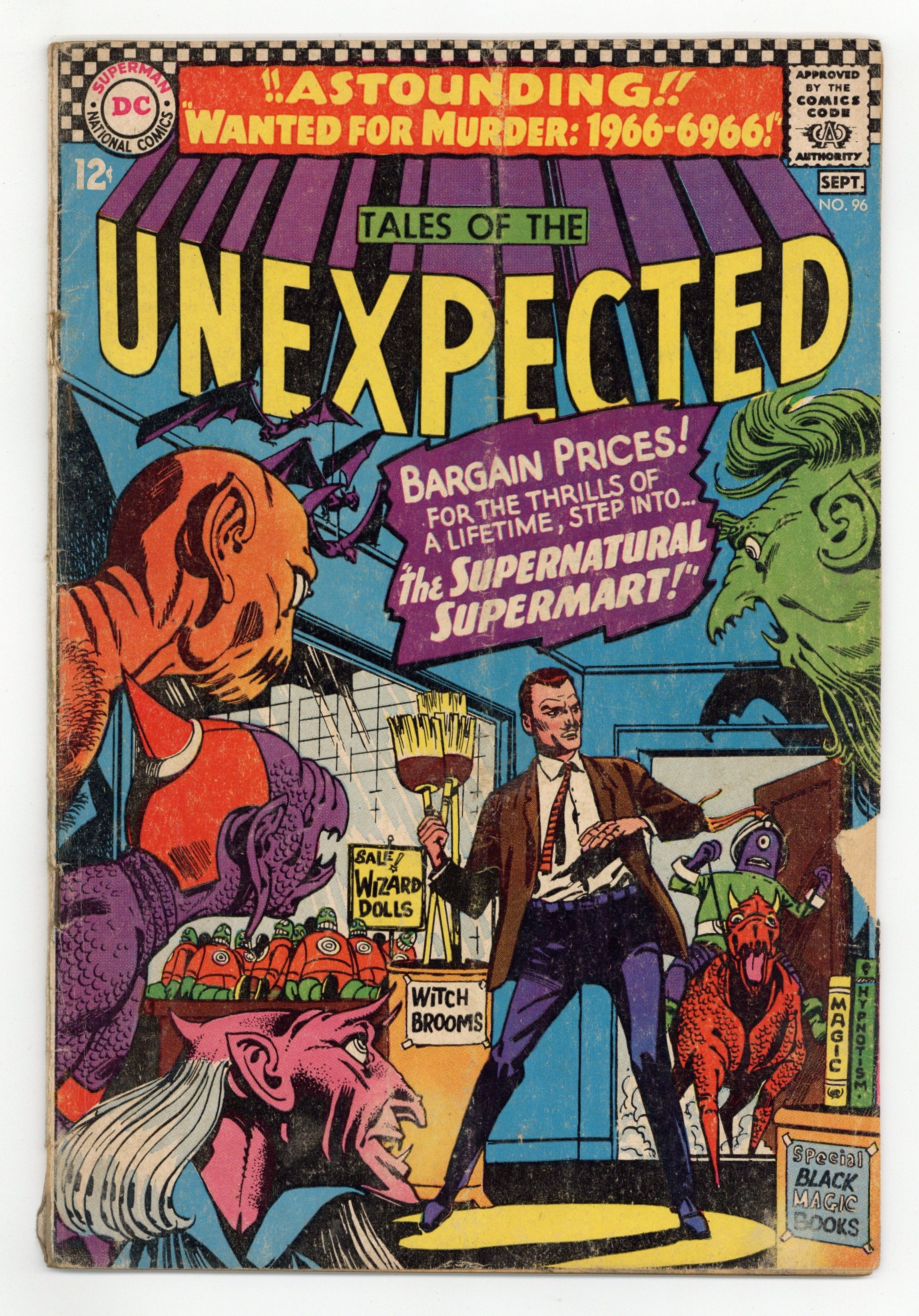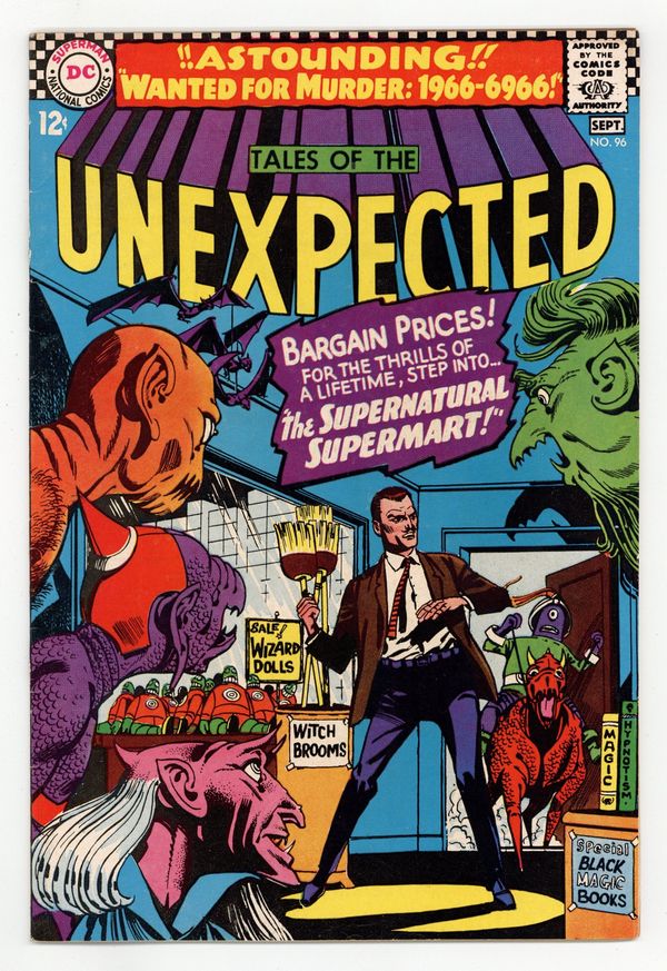 Cover art by Bernard Baily. Wanted for Murder... 1966 ....6966, art by George Roussos; Criminal "Sparkler" Slade is captured by policemen from the year 6966 for a murder in that time. House ad for Superman's Pal, Jimmy Olsen #95, pencils by Curt Swan, inks by George Klein. The Policeman Is Your Friend public service announcement, script by Jack Schiff, art by Sheldon Moldoff. The Captives of the Time-Stone, art by Jack Sparling. The Supernatural Supermart, art by Bernard Baily; Nick Bragan schemes to steal artifacts from a museum by making it appear that an ancient curse is real, but when he encounters the Green Glob he is transported to a weird world where magic really exists and his life is in danger. 36 Pages, Full Color. Cover price $0.12.