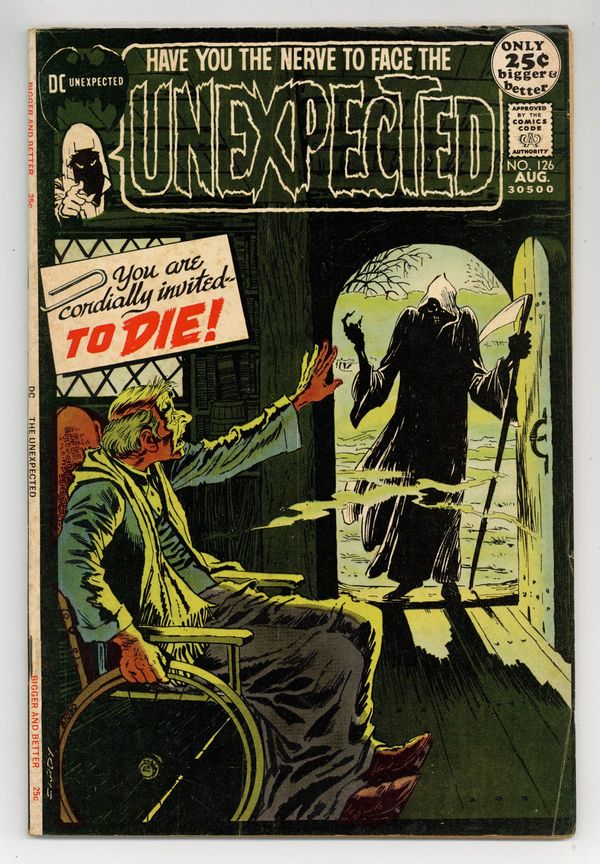 Cover art by Nick Cardy. You Are Cordially Invited-- to Die!, script by George Kashdan, pencils by Dick Dillin, inks by Vince Colletta. A Cat Tale, script by Murray Boltinoff [as Al Case], art by Rich Buckler. The Doomsday Drum, script by Dave Wood, art by Joe Maneely. Please Let Me Die!, script by Dave Wood, art by Bruno Premiani. The Town That Buried Me Alive!, art by Alex Toth. The Strange Mind of Mother Shipton text story by Gus Kelly. Seek Your Own Grave!, script by George Kashdan, art by Jerry Grandenetti. Silk Gauze. 52 pgs. $0.25. Cover price $0.25.