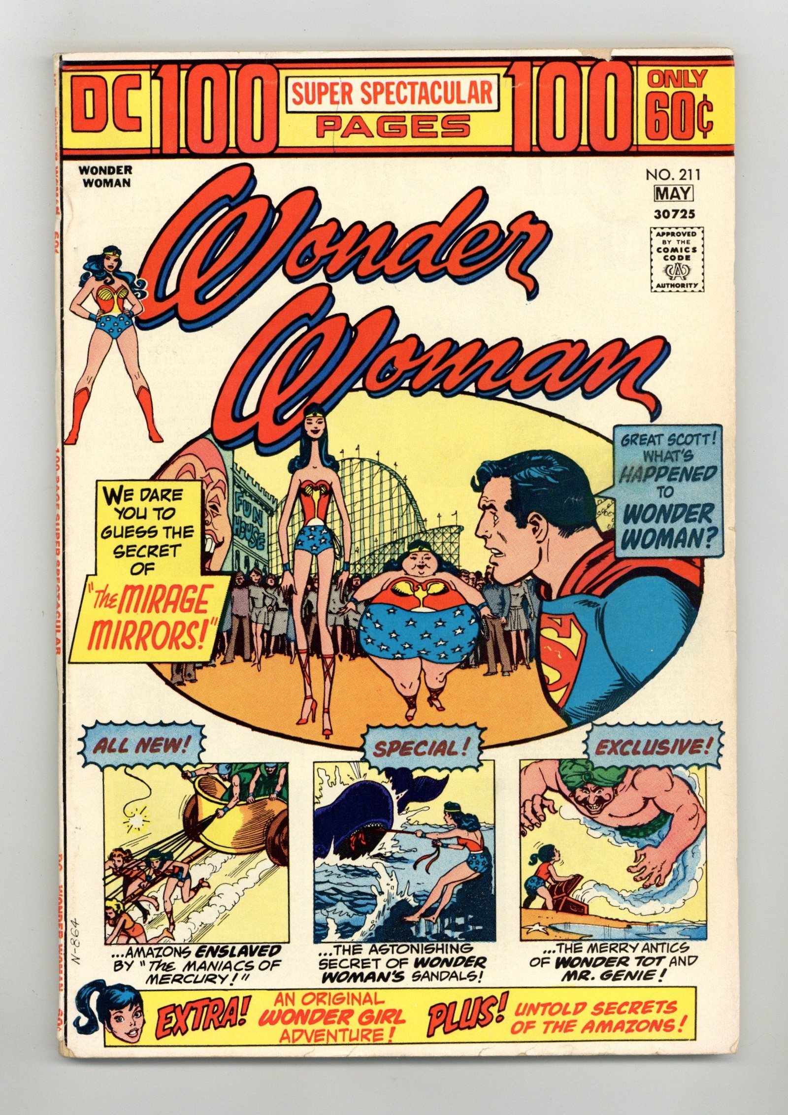 100-page giant. Cover by Nick Cardy. New stories: "The Maniacs of Mercury," script by Robert Kanigher, pencils by Ric Estrada, inks by Vince Colletta; When a space mission in Wonder Womans robot plane goes awry, the heroine saves herself and two sister Amazons from falling into the sun by diverting their course to land them on Mercury; There they become prisoners of the giant Mercurian males, led by King Celerito, who have enslaved all their women; Rehash of Wonder Woman #26, "Speed Maniacs from Mercury." Reprints: "The Origin of the Amazon Plane!", script by Robert Kanigher, art by Harry G. Peter; Wonder Woman discovers a miniature sun in the crater of an atomic bomb test and recovers it for study in Paradise Island; The Amazons discover that an atom of uranium from the sun is really a miniature planet, controlled by female "protons" led by Queen Atomia. "Wonder Woman Amazon Teen-Ager!", script by Robert Kanigher, pencils by Ross Andru, inks by Mike Esposito; Origin of Wonder Girl's costume. "The Winning of Wonder Woman's Tiara!", script by Robert Kanigher, art by Harry G. Peter. "Wonder Tot and Mister Genie!", script by Robert Kanigher, pencils by Ross Andru, inks by Mike Esposito. "The Secret of Wonder Woman's Sandals!", script by Robert Kanigher, art by Harry G. Peter. "The Mirage Mirrors!", script by Robert Kanigher, pencils by Ross Andru, inks by Mike Esposito. Statement of ownership - average print run 313,000; average paid circulation 145,054. 100 pages, Full Color. Cover price $0.60.