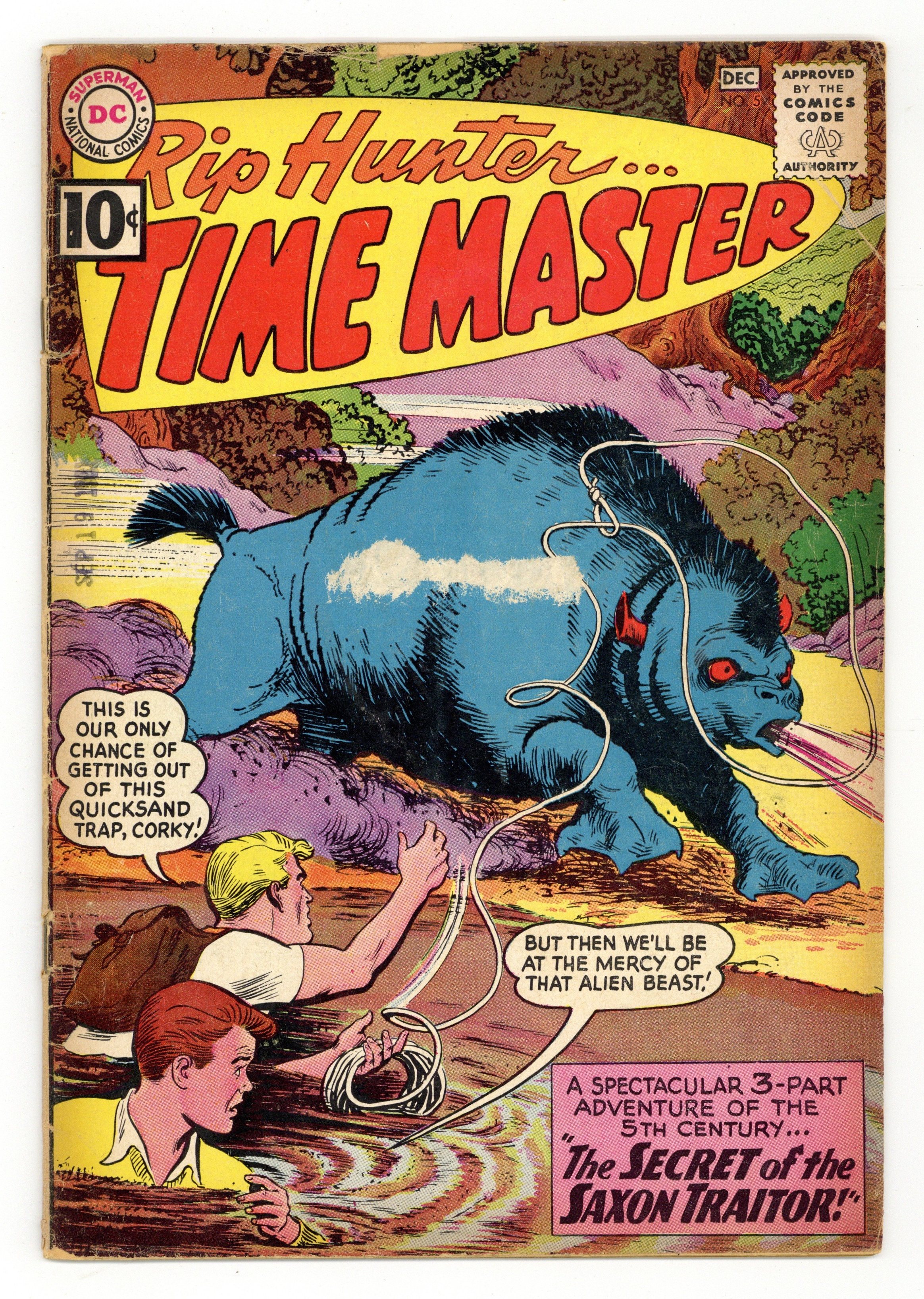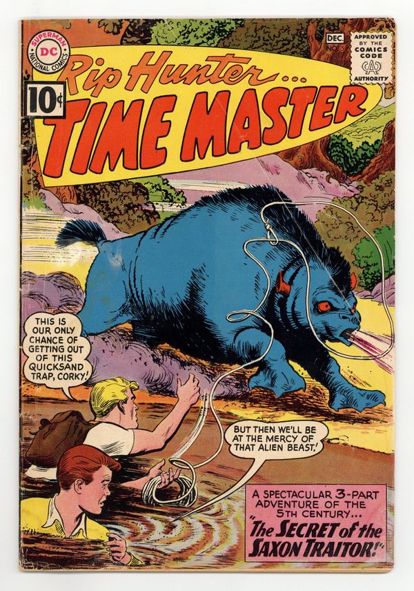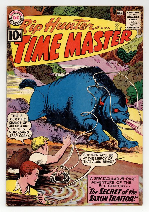 Last 10c cover-priced issue. Written by Jack Miller. Art and Cover by Nick Cardy. Rip and Corky have only one chance of getting out of the quicksand trap! But then they'll be at the mercy of an alien beast! Don't miss Rip Hunter in the spectacular 3-part adventure of the 5th century by Jack Miller and Nick Cardy: "The Secret of the Saxon Traitor"; "Chapter 2: The Creatures of Doom Valley"; and "Chapter 3: The Ancients vs. the Aliens"! Plus: 1-page text piece "The Hoax That Won a War!" 32 pages, full color. Cover price $0.10.