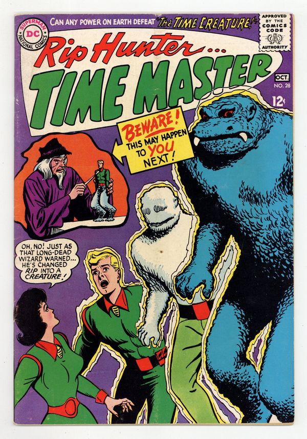 Rip Hunter, the Time Creature - Written by George Kashdan. Art and Cover by Bill Ely. Just as that long-dead wizard Kraklow warned, he's changed Rip Hunter into a creature! (Beware! This may happen to you next!) Can any power on Earth defeat...the time creature? Don't miss this spellbinding adventure, told in three chapters this issue! 32 pages, full color. Cover price $0.12.