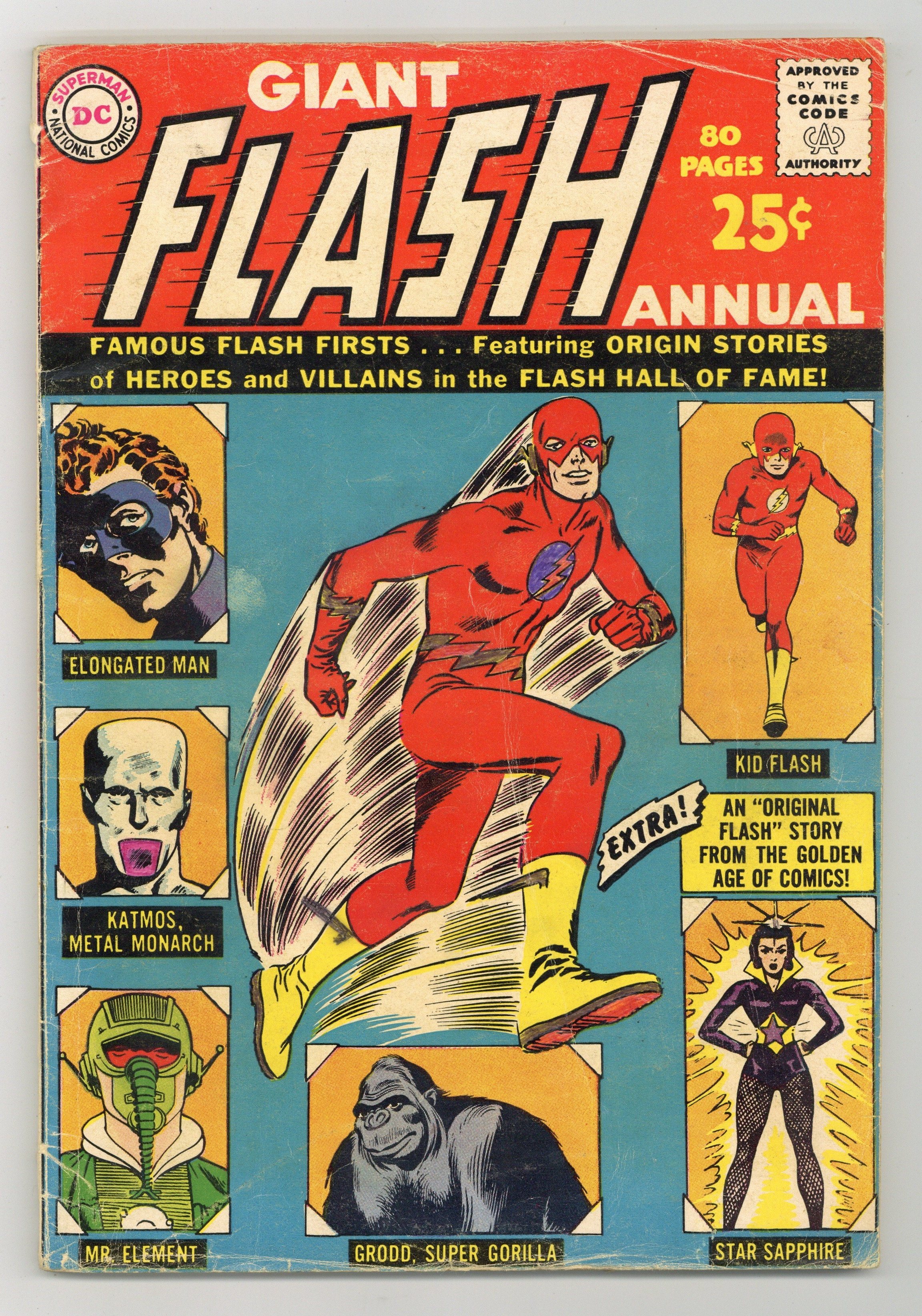 80-page Giant Size Annual. All reprints. Stories include "Conqueror From 8 Million B. C.," "Master of the Elements," "Mystery of the Elongated Man," "The Amazing Star Sapphire," "Menace of the Super-Gorilla," "Meet Kid Flash"; plus "How I Draw The Flash" (2 pages by Carmine Infantino); Famous Flash cover firsts; and a Flash index (issues 105-140, plus the Showcase issues featuring the Flash). Cover price $0.25.