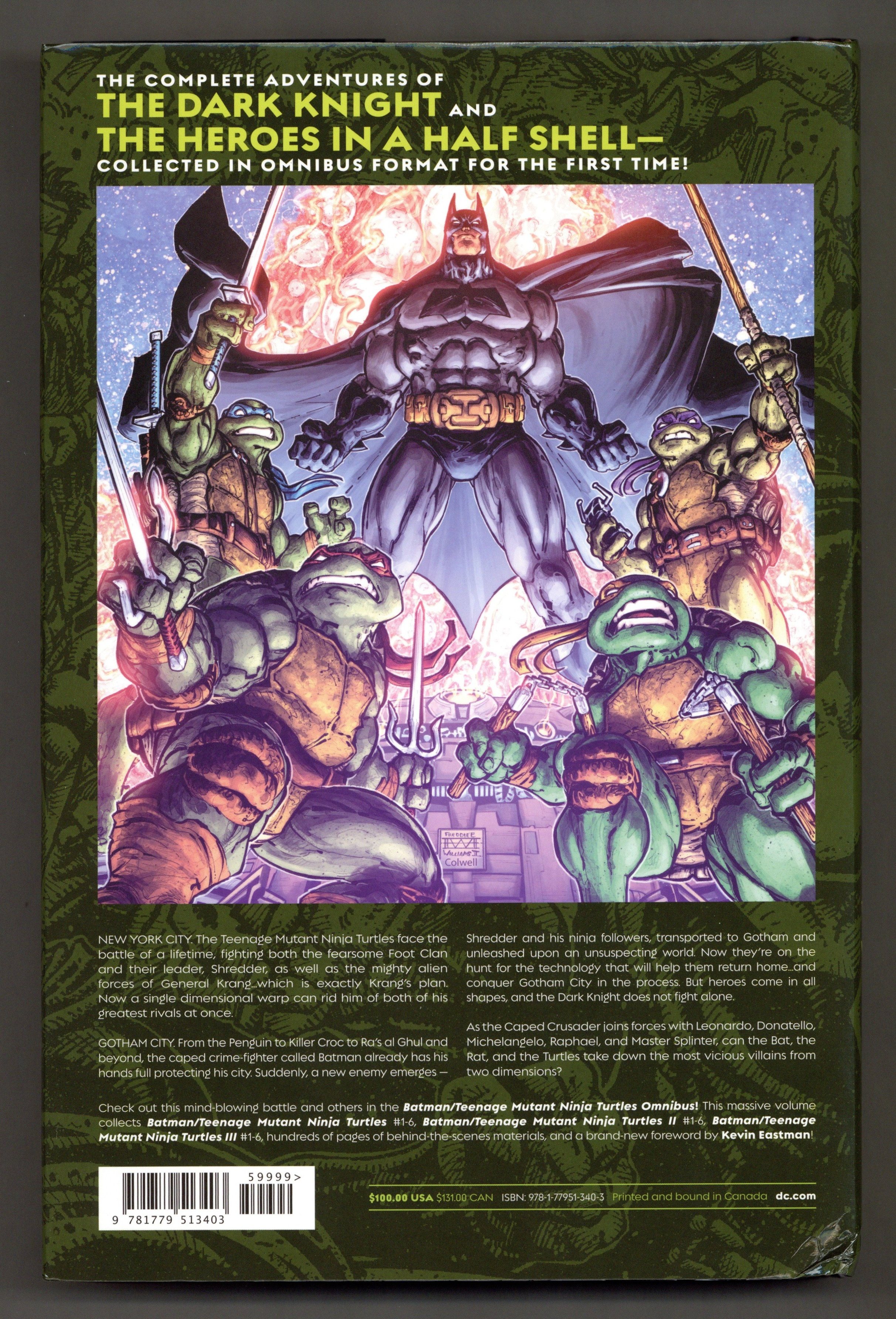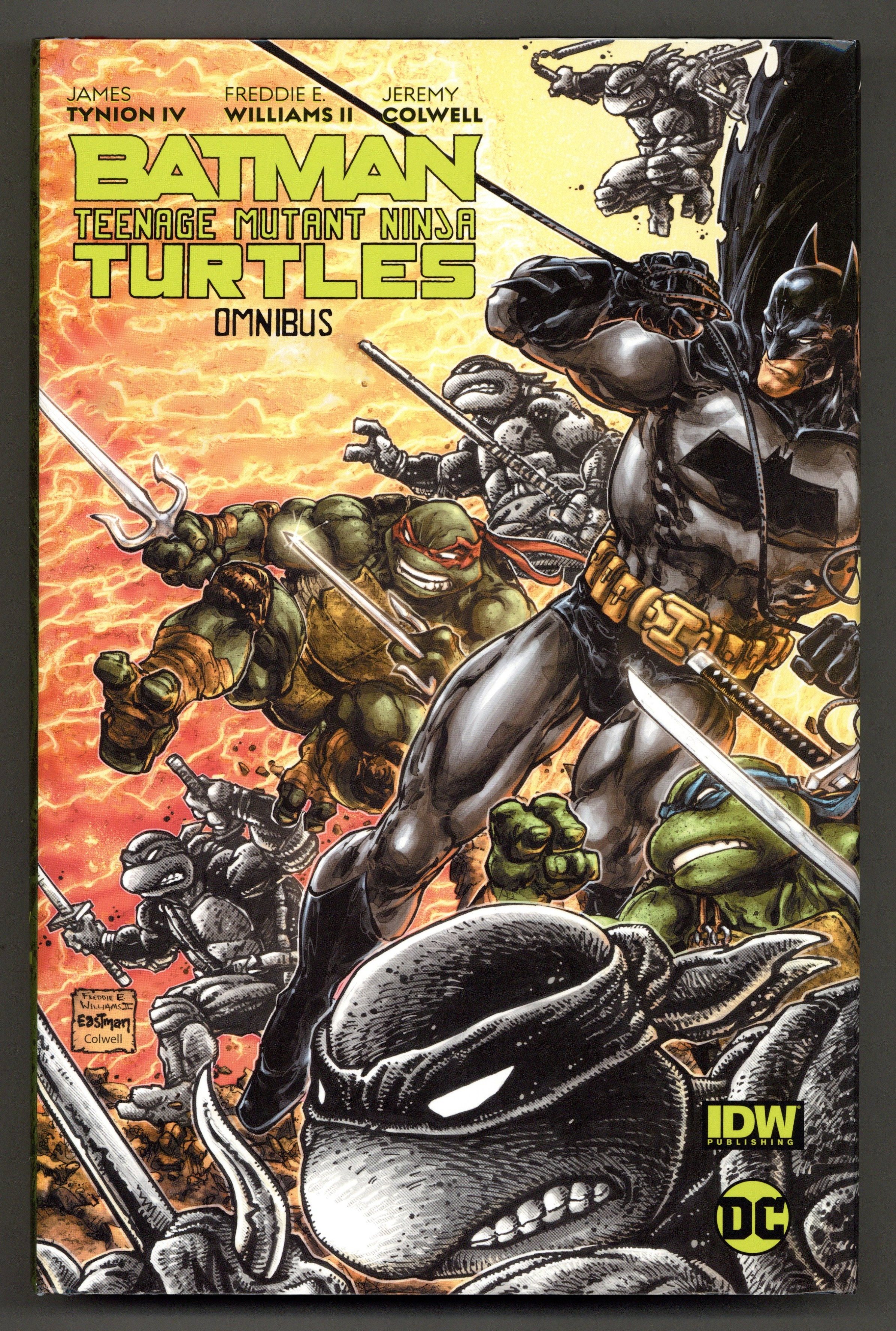 1st printing. Collects Batman/Teenage Mutant Ninja Turtles (2015 DC) #1-6, Batman/Teenage Mutant Ninja Turtles II (2017 DC) #1-6, and Batman/Teenage Mutant Ninja Turtles III (2019 DC) #1-6. Written by James TynionIV. Art by Freddie Williams II and Kevin Eastman. Cover by Kevin Eastman. New York City's Heroes in a Half Shell and Gotham's Caped Crusader join forces against their greatest enemies—Krang, the Shredder, The Joker, and more— in a trio of tales that mash up the dimensions of the Turtles and Batman... putting all of reality in jeopardy! This massive omnibus includes plus hundreds of pages of behind-the-scenes material from artist Freddie E. Williams II and a brand-new introduction by Teenage Mutant Ninja Turtles co-creator Kevin Eastman! Hardcover, 8 1/2-in. x 11-in., 576 pages, full color. Cover price $99.99.
