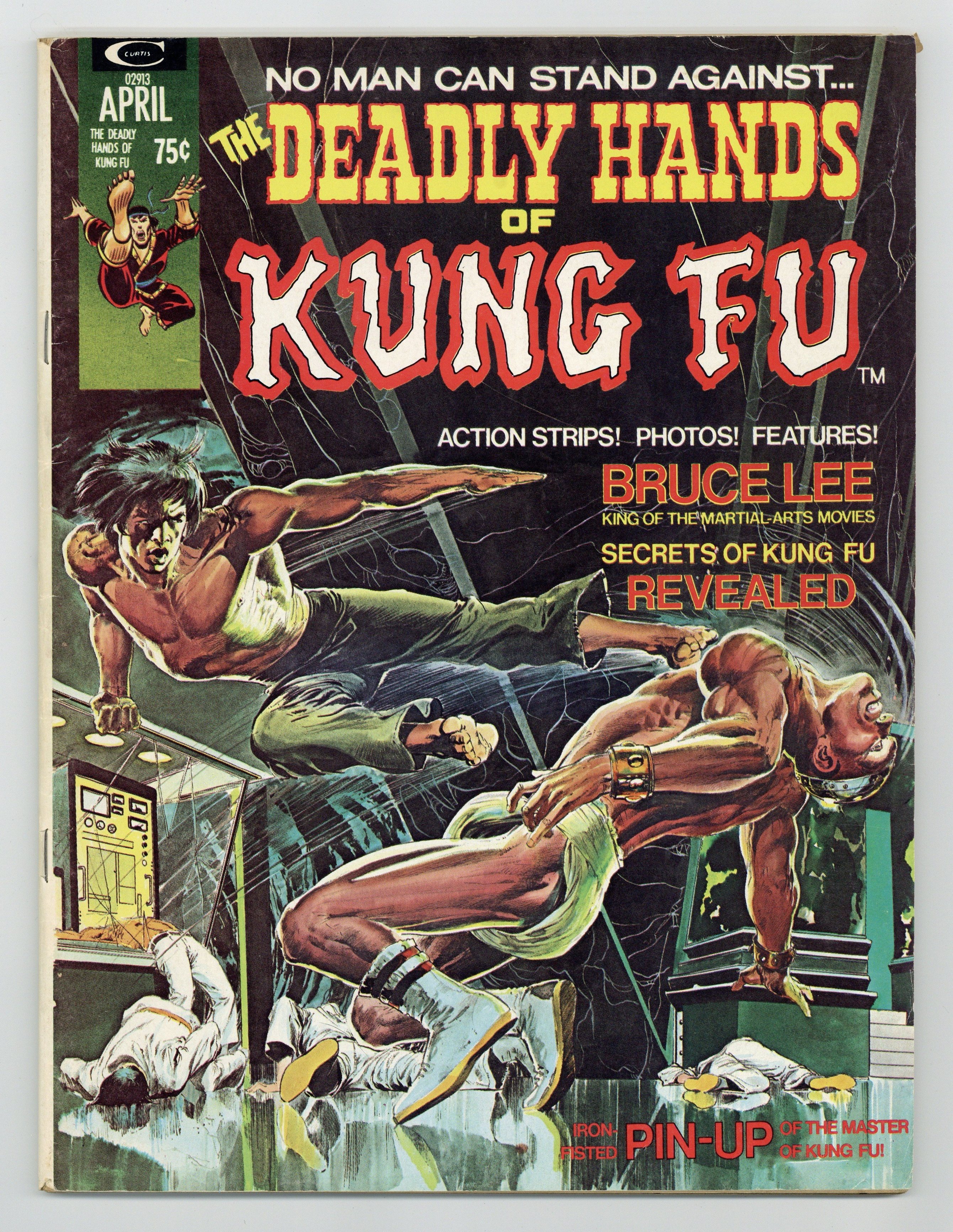 Stan Lee Presents: The Deadly Hands of Kung Fu. It's kung fu action adventure in the Mighty Marvel fashion. Cover by Neal Adams. Includes: "Shang Chi, the Master of Kung Fu!" Story by Steve Englehart. Art by Jim Starlin and Al Milgrom. "Heroes never Die!" An in-depth biography on Bruce Lee by Lorraine Zenka-Smith. "What to do Till the Sensei Comes!" A 4-page instructional on the fundamentals of martial arts. "Catching a Killer Red Handed!" A movie review of Five Fingers of Death by John David Warner. "The Way of the Tiger, the Sign of the Dragon, and the Click of the Neilsens!" An article about the TV show Kung Fu, starring David Caradine, by John David Warner. "Hai, Karate/Kung Fu Fan." An editorial by Roy Thomas. And, "Fu on You." An editorial by Marv Wolfman. Plus, a full length adventure with the Sons of the Tiger. Story by Gerry Conway. Art by Dick Giordano. Includes a B&W poster of Bruce Lee. Black and white. Cover price $0.75.