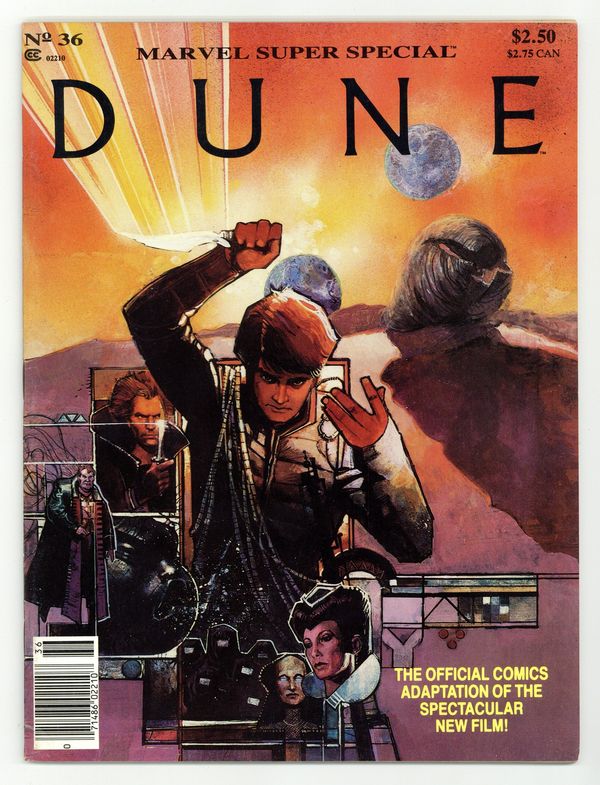 $22.50Dune. The official comic book adaptation of the David Lynch movie, based on Frank Herberts classic science fiction novel. In the far future, humanity adapts to life on a desert planet. Written by Ralph Macchio, with art by Bill Sienkiewicz. Story later reprinted in Dune #1-3. To date, the only comic book version of the Dune saga. Painted cover by Sienkiewicz. Full color; 68 pages. Cover price $2.50.