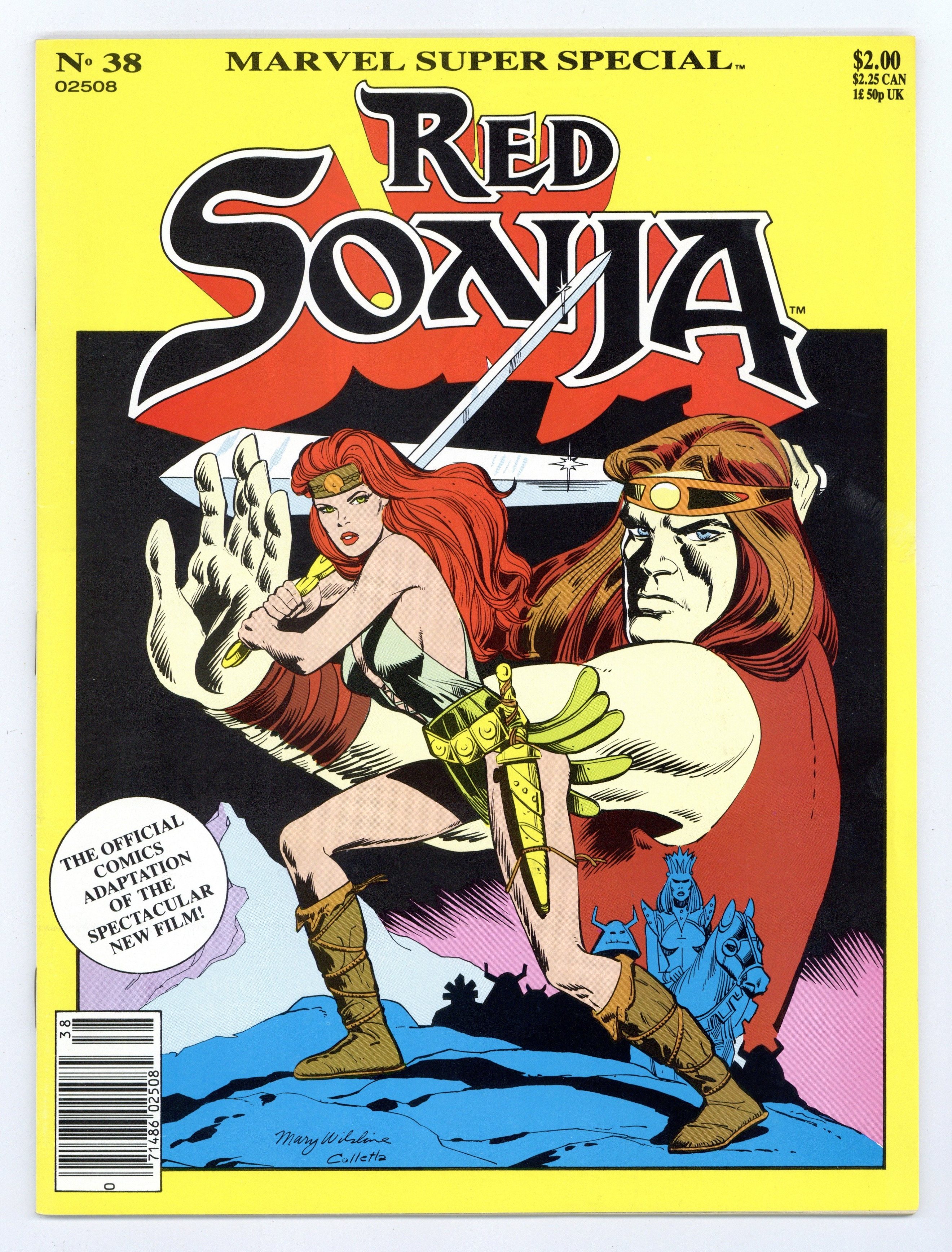 $27.00Red Sonja. The official comic book adaptation of the 1985 Red Sonja film starring Brigette Nielsen. The swordswoman goes on a quest for vengeance. Written by Mary Wilshire and Louise Simonson, with art by Wilshire; in fact, the entire production crew was female, except for inker Vince Colletta. Story later reprinted in Marvels Red Sonja (1985) #1-2. Cover by Wilshire. Full color; 52 pages. Cover price $2.00.