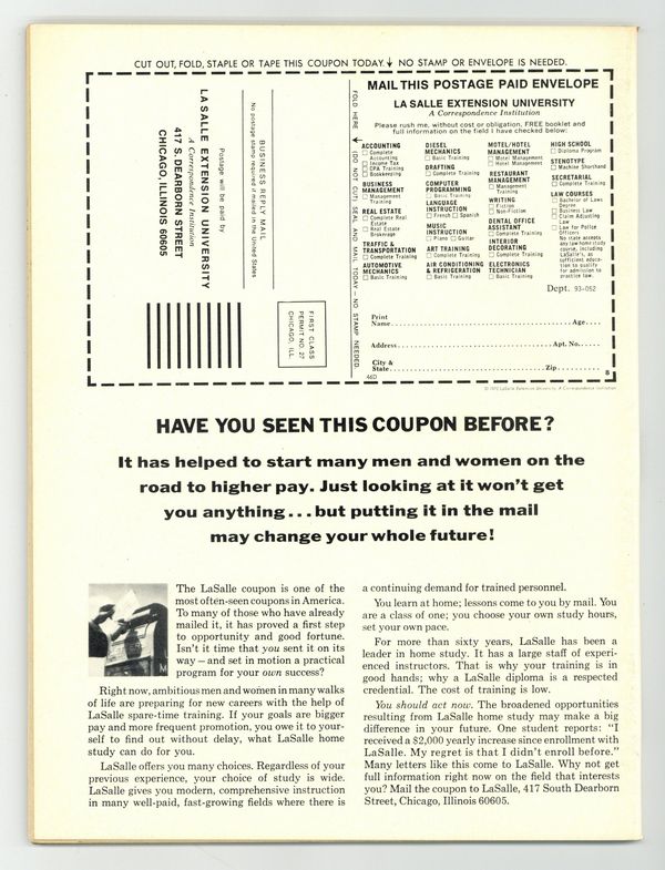 1st Appearance of Satanna. Edited by Roy Thomas. Cover by Frank Brunner. The Classic Monster!, script by Gary Friedrich, art by John Buscema, Syd Shores, and Win Mortimer; Derek removes the brain from the Frankenstein Monster and replaces it with the brain from Dr. Wallach. The Hands!, script by Stan Lee, art by Gene Colan. Our Martian Heritage text story by Chris Claremont. A Monster Reborn!, script by Steve Gerber, art by Pablo Marcos. The Killers, art by Bernie Krigstein. To Love, Honor, Cherish... ...'Til Death!, script by Chris Claremont, art by Don Perlin. 76 pgs., color. $0.75. Cover price $0.75.