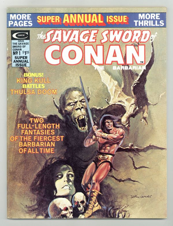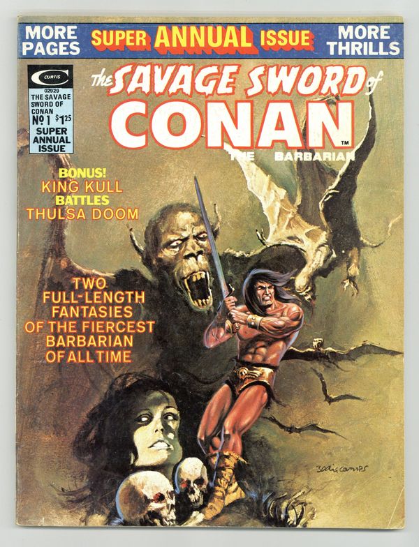 Summer 1975. Conan reprints: "Beware the Wrath of Anu" (script by Roy Thomas, pencils by Barry Windsor-Smith, inks by Sal Buscema; from Conan the Barbarian 10) and "The Web of the Spider-God" (also by Thomas/Windsor-Smith/Buscema, from a plot by John Jakes; from Conan the Barbarian 13). Kull reprints: "The Forbidden Swamp" (script by Thomas, pencils by Marie Severin, inks by John Severin) and "The Death-Dance of Thulsa Doom!" (also by Thomas/Severin/Severin). Windsor-Smith frontispiece (reprint). Badia cover. Cover price $1.25.