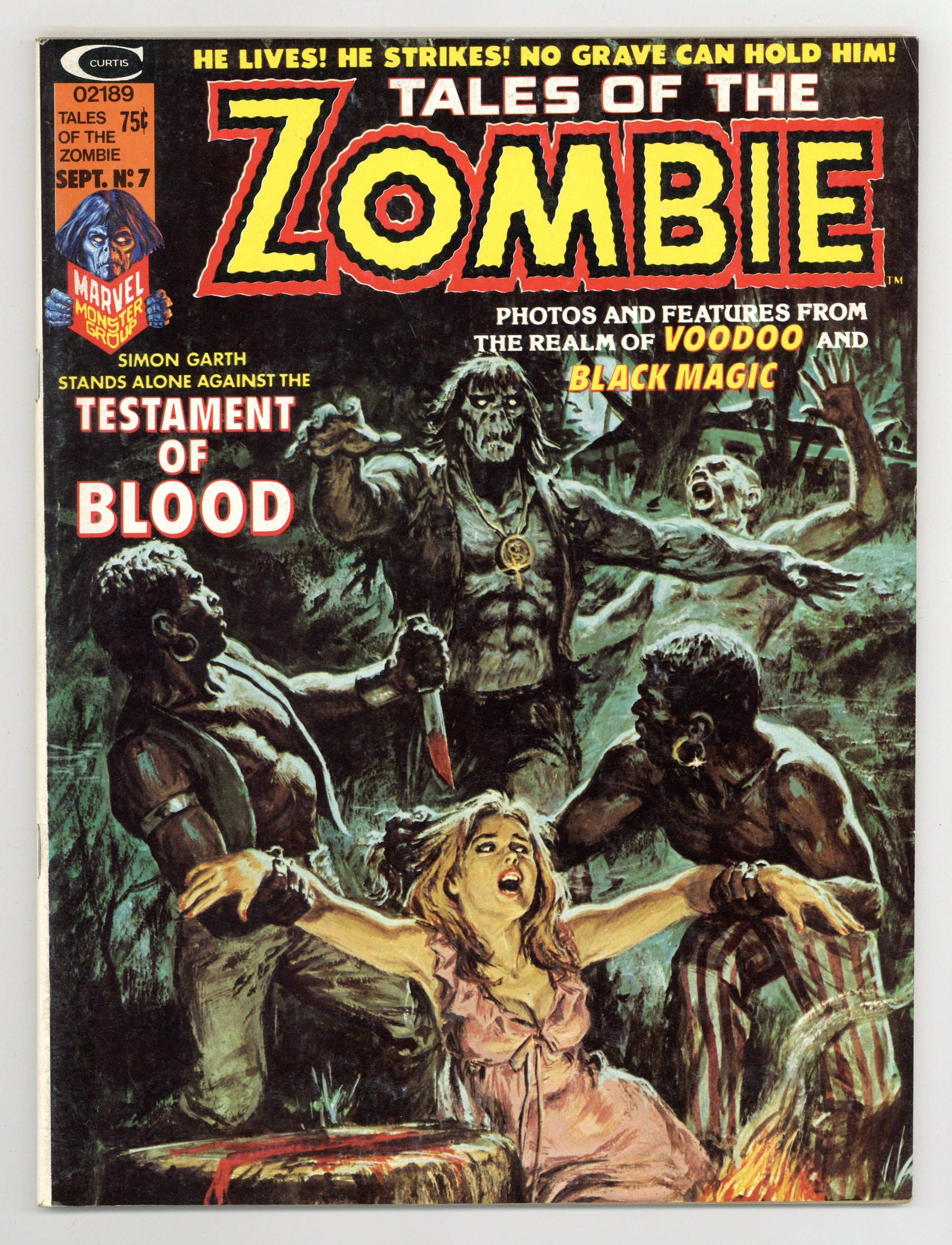Simon Garth dies but is brought back to life as a zombie and doomed to walk the earth as one of the living dead. In "The Blood Testament of Brian Collier," the zombie wanders onto the grounds of a mansion where murder and mysterious happenings are taking place. Script by Doug Moench and art by Alfredo Alcala. Issue also has "Voodoo in the Park" (Article by Kenneth Dreyfack), "Haiti's Walking Dead" (Script by Doug Moench and art by Win Mortimer), "Inside 'Inside Voodoo'" (Article by Chris Claremont), "A Second Chance to Die" (Script by Carl Wessler and art by Alfredo Alcala), and a photo feature with Stan Lee promoting Crazy magazine. All stories are in black and white. Cover price $0.75.