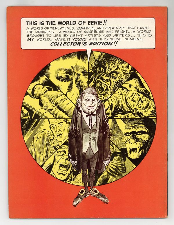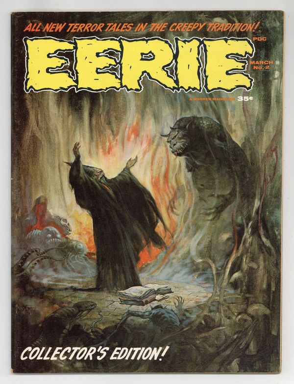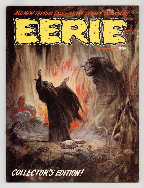 This is the first actual magazine-sized issue of Eerie (the first was an ashcan edition). Stories in this issue include: Footsteps of Frankenstein by Reed Crandall and Archie Goodwin; One for De-Money by Angelo Torres and E. Nelson Bridwell; Eye of the Beholder by Jay Taycee and Archie Goodwin; Flame Fiend by Gray Morrow and Eando Binder; To Pay the Piper by Eugene Colan and Larry Ivie; Vision of Evil by Alex Toth and Archie Goodwin; and Ahead of the Game by Joe Orlando and Archie Goodwin. Cover art by Frank Frazetta. Cover price $0.35.