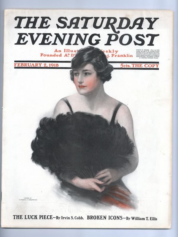 Tags: Anthology / CollectionPublished Feb 1918 by Curtis Publishing Co..$96.00Vol. 190 #31 - Feb. 2, 1918. The classic magazine featuring current event articles, editorials, human interest pieces, humor, illustrations, a letter column, poetry, single-panel gag cartoons, and stories by the leading writers of the time. Cover art by Clarence Underwood. Fiction by Irvin Cobb, Kenneth Roberts, George Weston, Marion Angellotti, Arthur Train. Interior art by Harry Wicker, Will Grefe, Frank Street, Herbert Johnson, Grant Reynard, Lejaren Hiller. 11-in. x 14-in., black and white, 96 pages. Cover price $0.05.