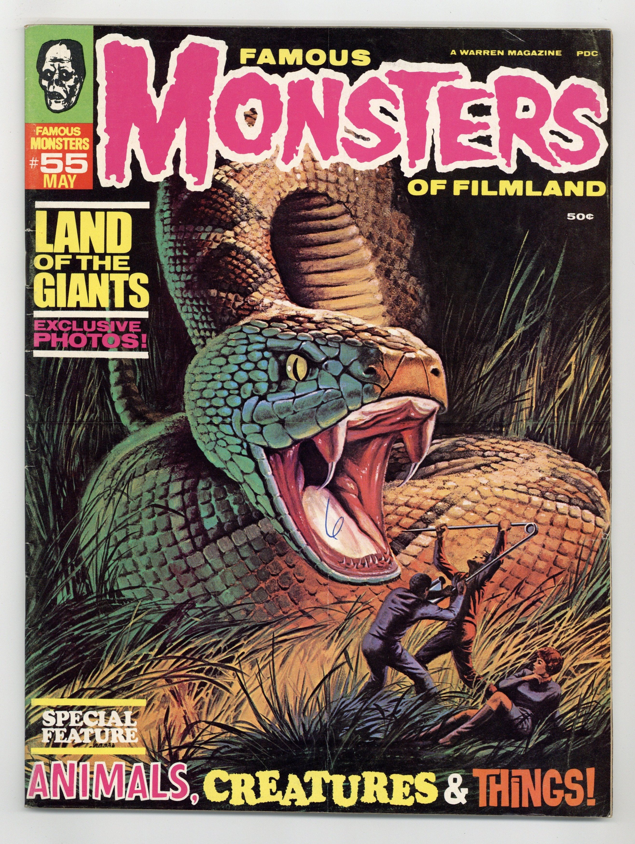 Features in this issue include: a reprint of the "Hunchback of Notre Dame" filmbook; an obituary of legendary makeup artist Jack Pierce; "Fang Mail" (featuring a picture of artist Richard Corben in monster makeup); short story "Dracula 2000"; and more. The uncredited cover painting is of a snake on the make in Land of the Giants (the mag contains a preview of the film). Cover price $0.50.