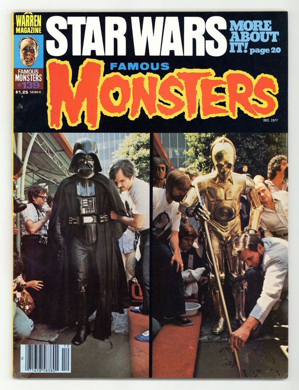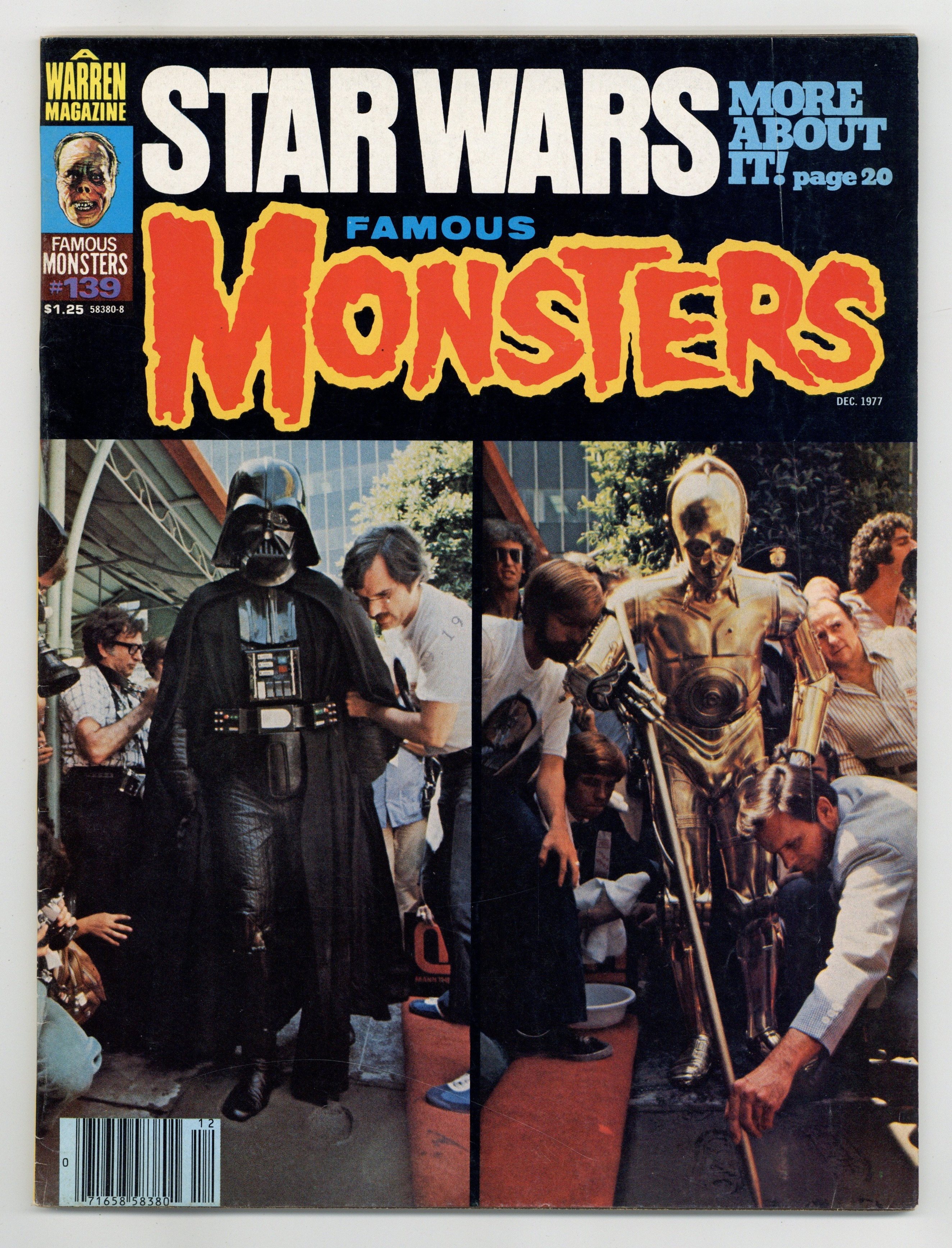 $20.00Features in this issue include: part two of The Fearless Vampire Killers filmbook; Obituaries of Allison Hayes and Ricardo Cortez; article on werewolf lore and myth; feature on The Tribe; speculation on life in outer space; and more. The cover, which is the third one in a row featuring Star Wars, shows Darth Vader and C-3PO immersing their feet in cement outside Mann's Theatre. Cover price $1.25.