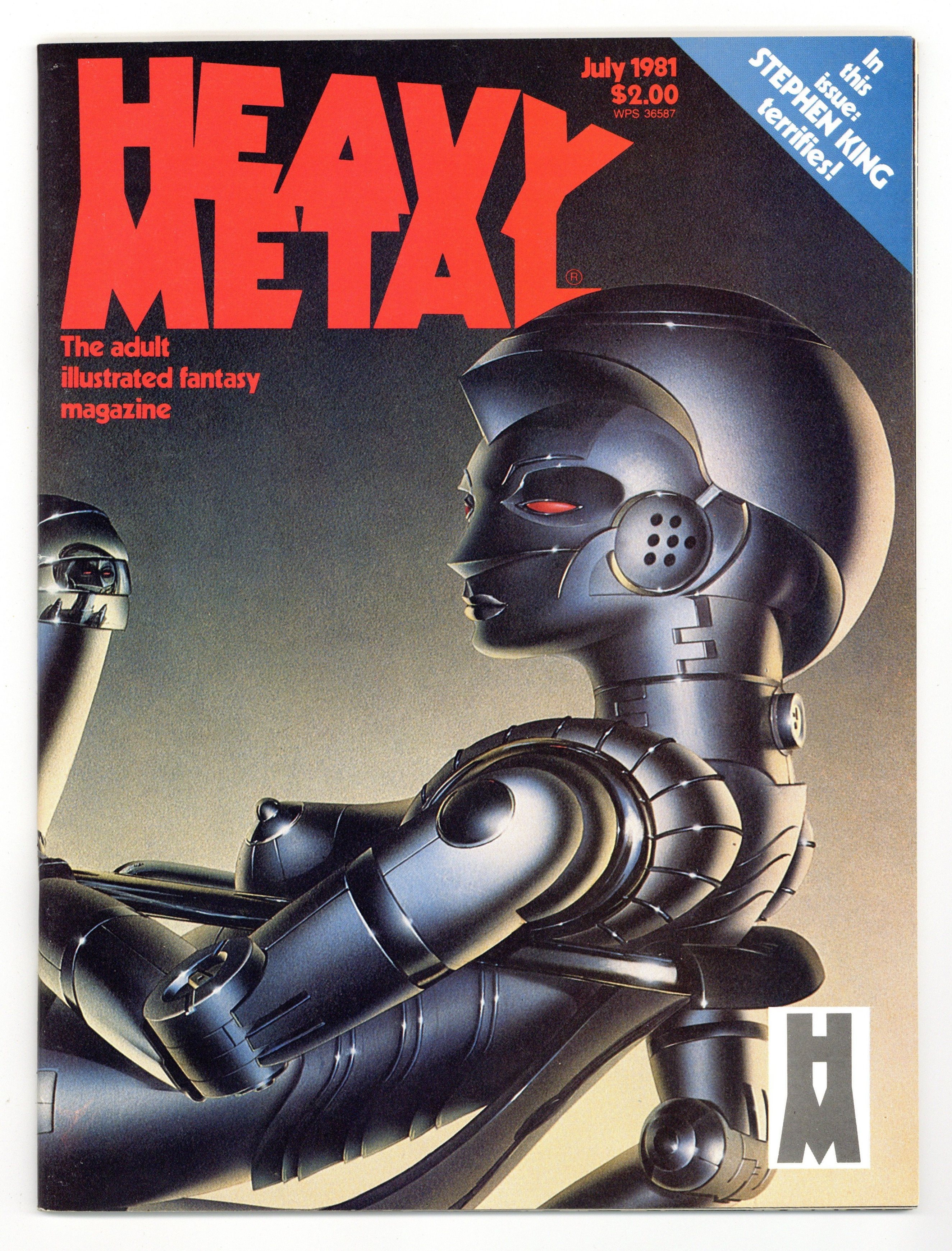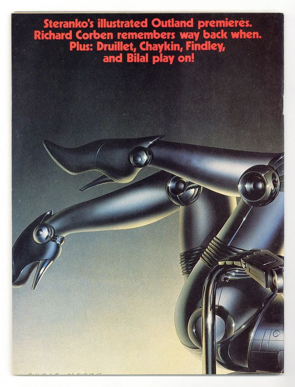 Published Jul 1981 by HM Communications.$30.00Direct Edition. The adult illustrated fantasy magazine. Cover art by Chris Moore. Advertisement for Jeffrey Jones' book Yesterday's Lily. Advertisement for the Heavy Metal Movie. The Richard Corben Interview. Bloodstar, script by Robert E. Howard (original story), John Pocsik (adaptation), and John Jakes (adaptation), art by Richard Corben. Tex Arcana (Part 5), script and art by John Findley. The Blue Air Compressor text story, script by Stephen King, art by Walter Simonson. Firaz, script by Philippe Druillet, art by Monsieur Picotto. Outland, script by Peter Hyams (original story) and Jim Steranko (adaptation), art by Jim Steranko. The Immortals' Fete, script and art by Enki Bilal. Paradise, script and art by Vicente Alcazar. Whoodoo The Voodoo?, script and art by Philippe Cazaumayou. Dax Prometheus (Part 3) starring Cody Starbuck, script and art by Howard Chaykin. July, 1981, issue 52. 100 pgs. Cover price $2.00. Cover price $2.00.