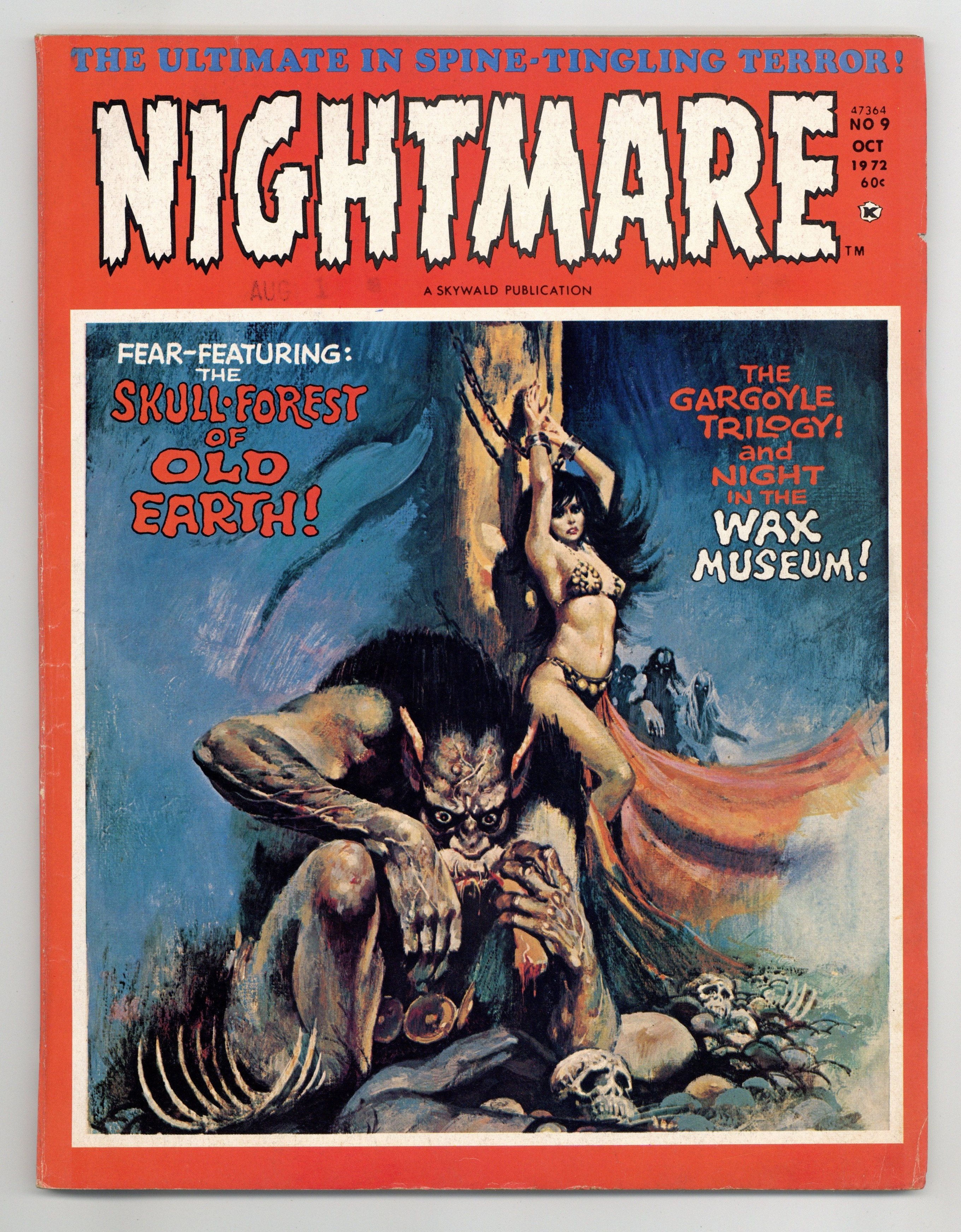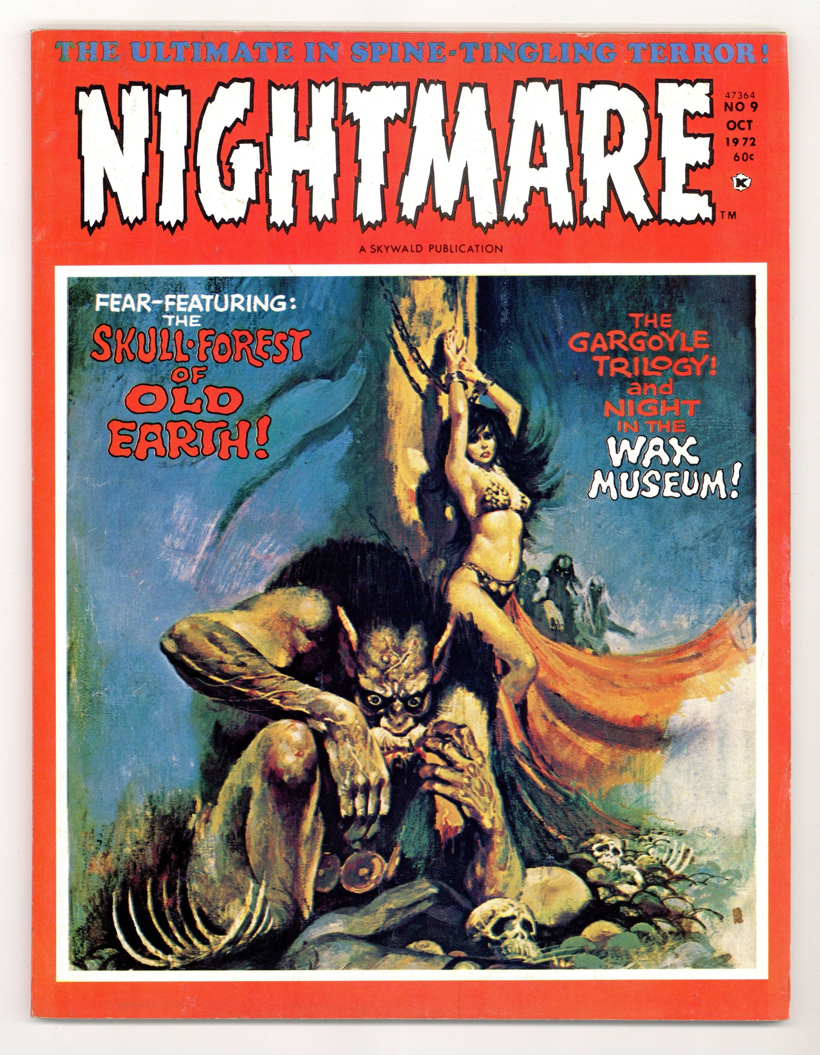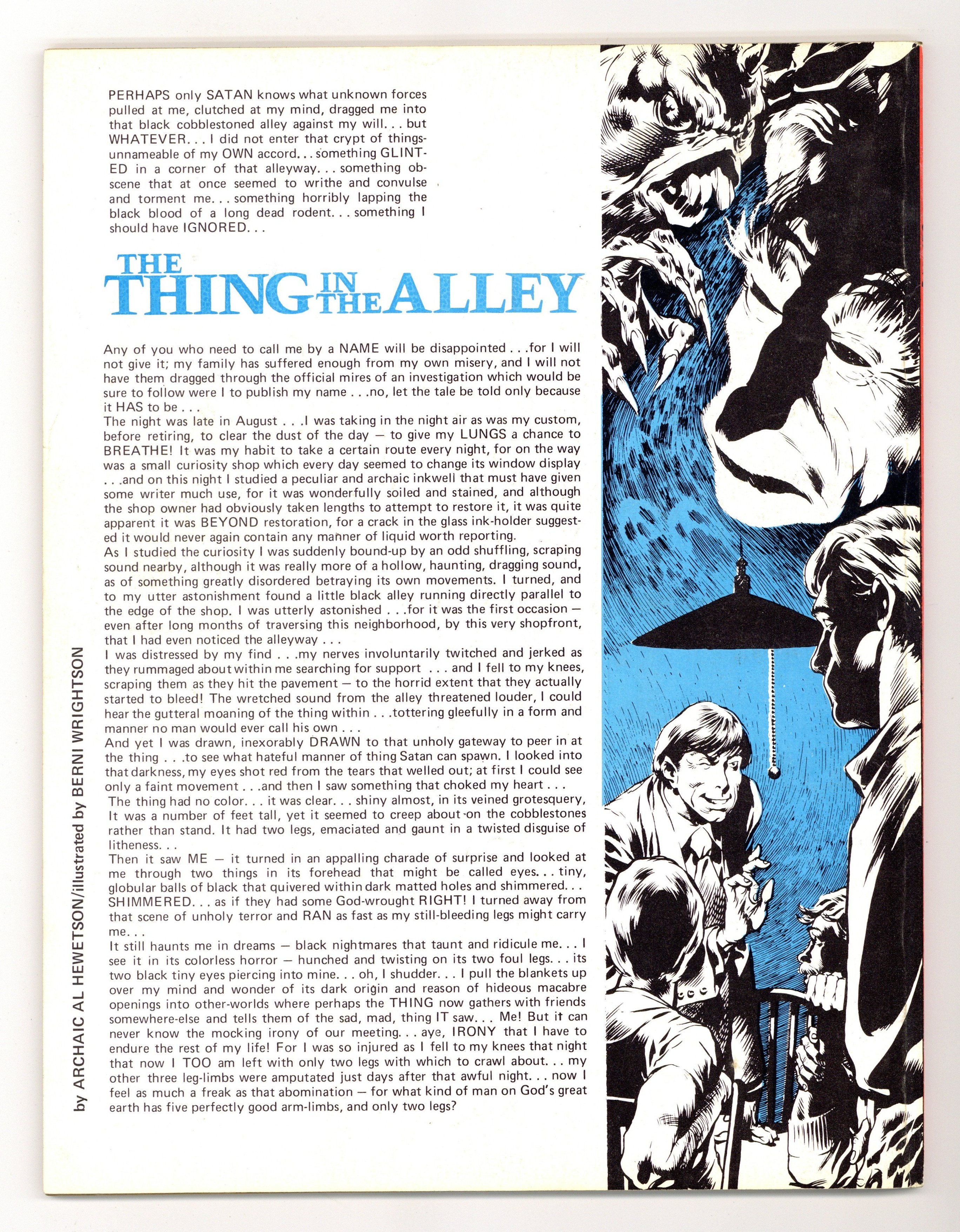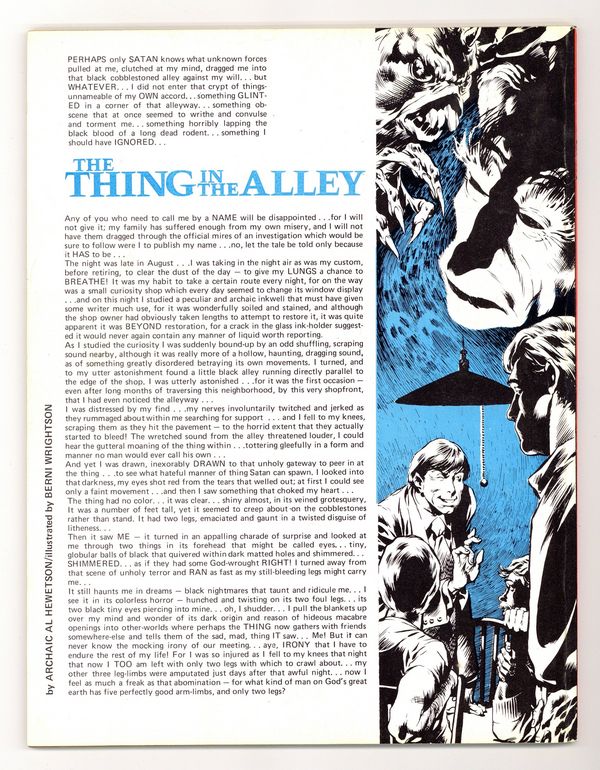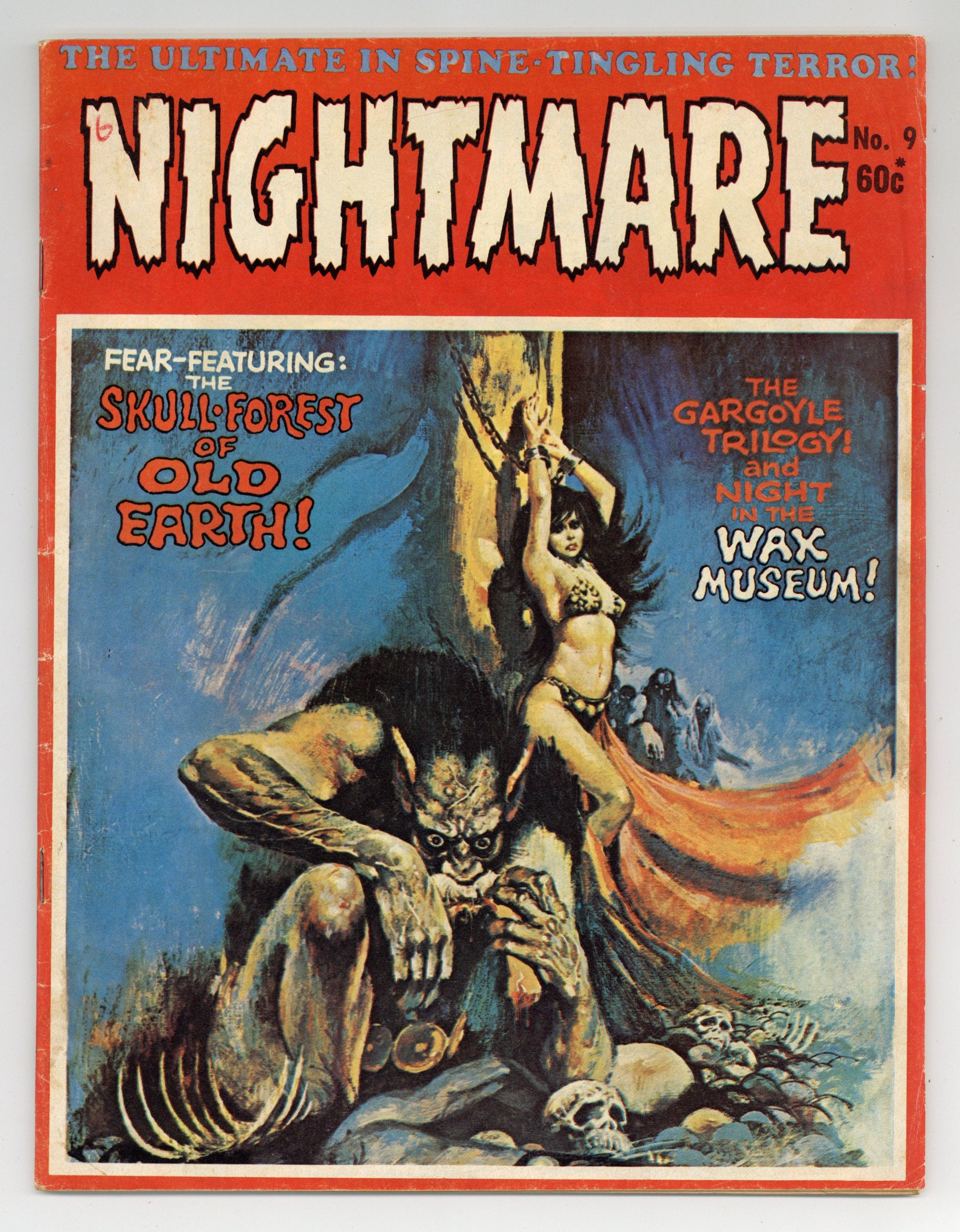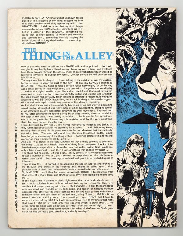 Cover art by Jose Mirelles. Markheim, script by Robert Louis Stevenson (author) and Al Hewetson (adaption), art by Jesus Duran (as D. Duran). The Nightmare World Of James Edgar: Call Them Ghouls, Call Them Trolls, Call Them Things, script by James Edgar and Al Hewetson, art by Pablo Marcos. The Guillotine, script by Al Hewetson, art by Felipe Dela Rosa. Zoo For The Beasts Of The Universe, script by Al Hewetson, art by Maelo Cintron. The Skull Forest Of Old Earth starring The Shoggoths, script by Al Hewetson, art by Zesar Lopez. The Abominable Dr. Phibes article with photos. The 300th Birth Day Party, script by Al Hewetson, art by Ramon Torrents. The Gargoyle Trilogy, script by Al Hewetson, art by Felipe Dela Rosa. The Night In The Wax Museum, script by Al Hewetson, art by Villanova. Dracula, script by Al Hewetson, art by Pablo Marcos. The Beast Within, script by Al Hewetson, art by Amador Garcia. The Thing In The Alley text story by Al Hewetson, art by Berni Wrightson. 68 pgs. $0.60. Cover price $0.60.