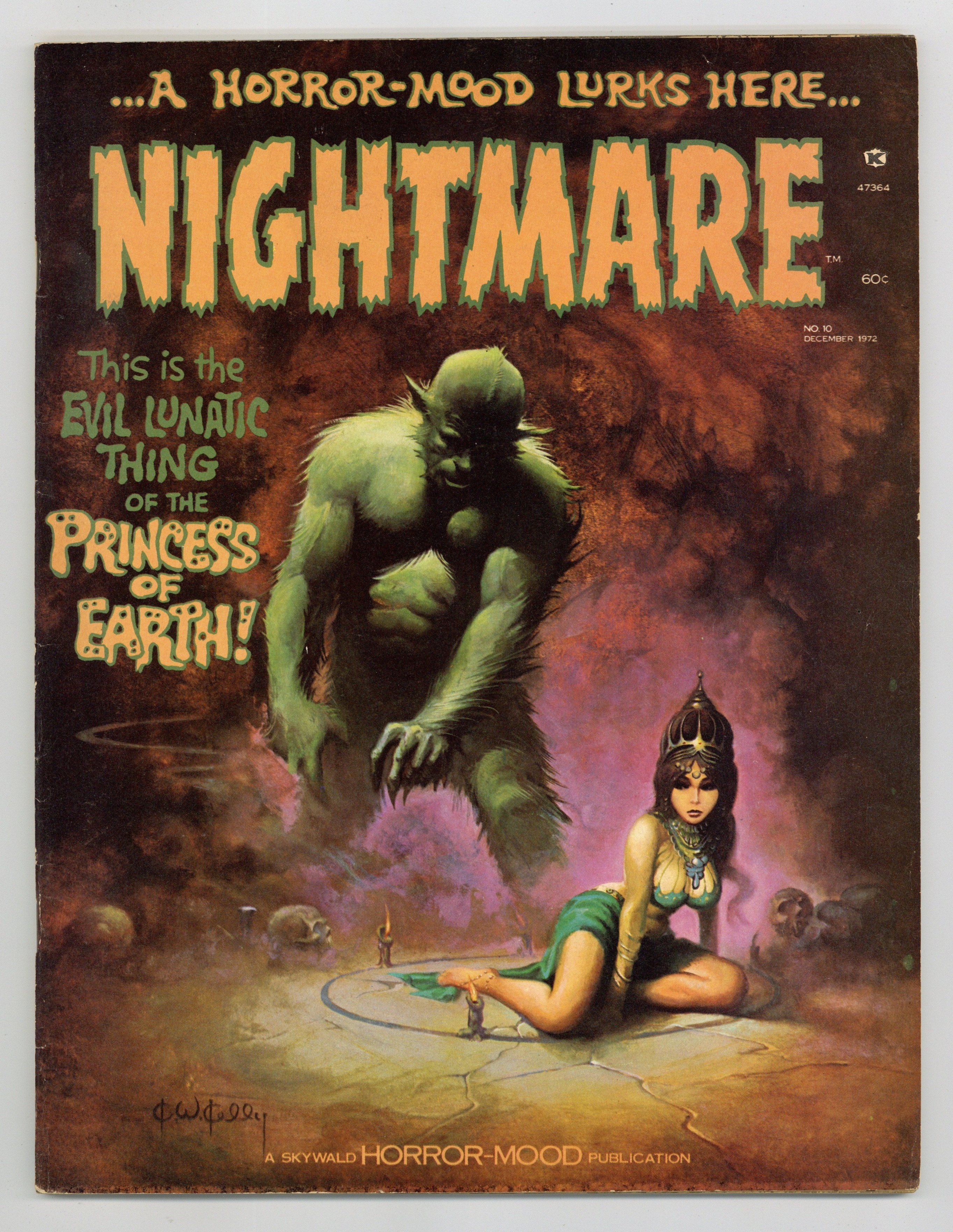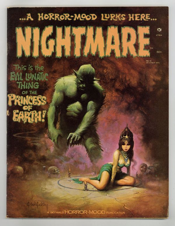 Cover art by Ken Kelly. Princess Of Earth!, script by Al Hewetson, art by Pablo Marcos. Frogs movie review by Hewetson, art by Berni Wrightson. The Funeral Barge, script by Al Hewetson, art by Juez Xirinus. Satan's Cellar, script by Al Hewetson, art by Ferrer Maitz. The Proverbial Killer, script by Doug Moench, art by Villanova. A Macabre Fact Of Life: Demonic Possession, script by Al Hewetson, art by Pablo Marcos. The Nightmare World Of Trisha Hamlin Of Livingston, Kentucky: They Crawled Out Of The Crater, script by Al Hewetson, art by Lara. Black Communion, script by Ed Fedory, art by Felipe Dela Rosa. Slither Into The Concocted Lunacy Of The Astonishing Horror-Mood Within This Noxious Nightmare Number 10 article by Al Hewetson, art by Ernie Colon, Berni Wrightson, and Basil Wolverton. The Human Gargoyles, part 2: 1 And 1 Equals 3, script by Al Hewetson, art by Maelo Cintron. 68 pgs. $0.60. Cover price $0.60.