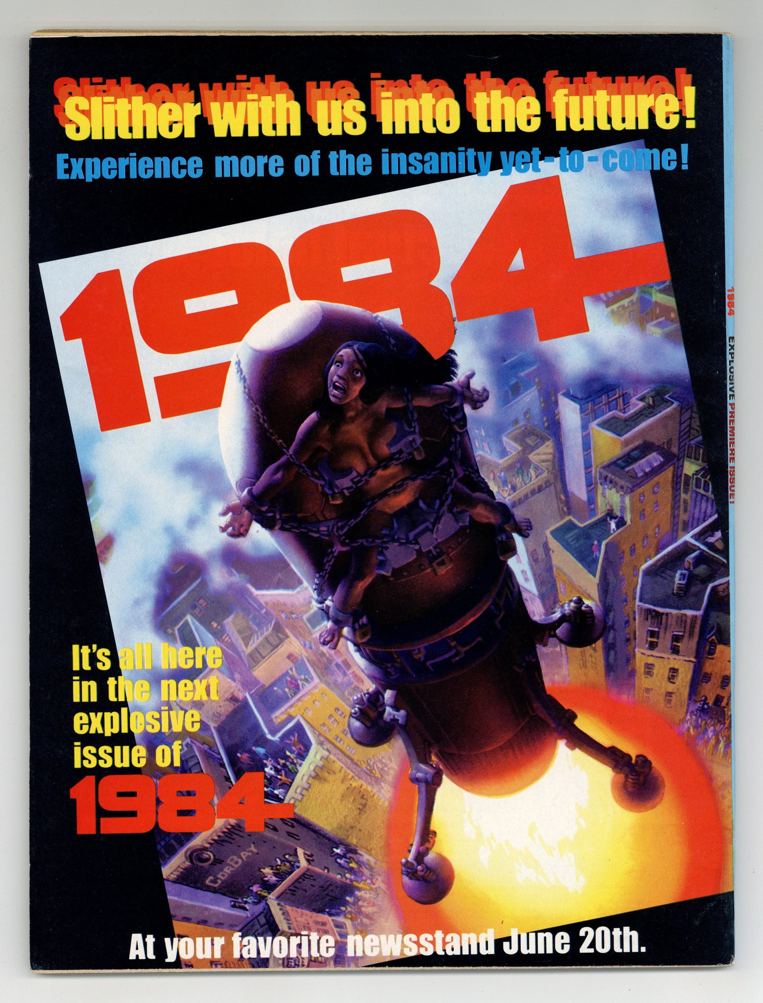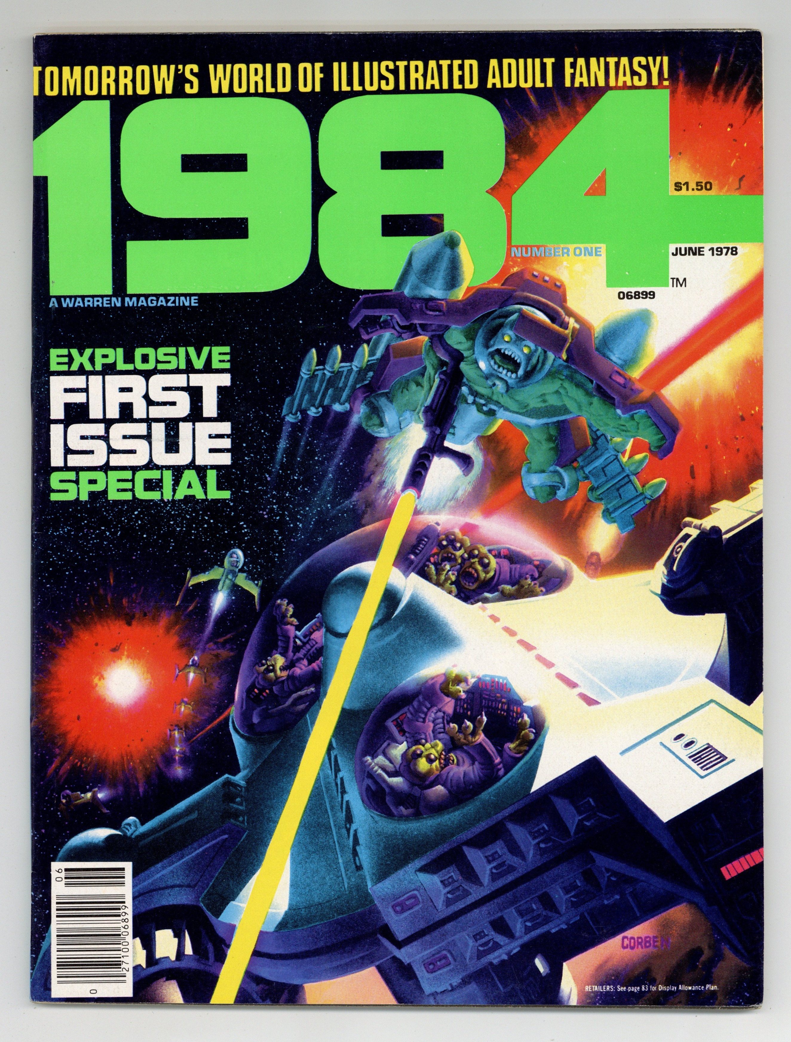 James Warren's answer to the successful debut of Heavy Metal magazine, 1984 features adult-oriented (and oftentimes downright sleazy) stories and art. The name change to 1994 occurred with issue number eleven, supposedly so newsstand browsers don't confuse the magazine with George Orwell's famous novel. Issue #1 includes the following stories: Last of the Really Great, All-American Joy Juice by Bill DuBay and Jose Ortiz; The Saga of Honey Dew Melons by Nicola Cuti and Esteban Maroto; Once Upon Clarissa by Bill DuBay and Alex Nino; Quick Cut by Bill DuBay and Wally Wood (story credited solely to Wood); The Saga of Xatz and Xotz by Bill DuBay and Alfredo Alcala; Bugs! by Bill DuBay and Joe Vaultz; Mutant World by Richard Corben (in color); Faster-than-Light Instellar Travel by Jim Stenstrum and Luis Bermejo; Angel! by Bill DuBay and Rudy Nebres; and Momma, Can You Hear Me? by Nicola Cuti and Alex Nino. Cover art by Richard Corben. Cover price $1.50.