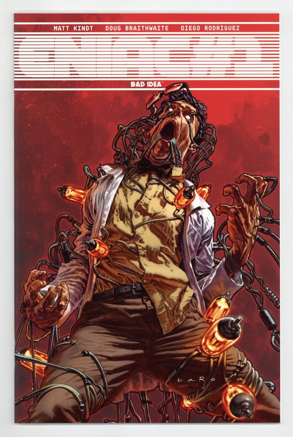 Story by Matt Kindt. Art by Doug Braithwaite and Diego Rodriguez. Cover by Lewis LaRosa and Laura Martin. Back cover by Matt Kindt. Seventy-seven years ago, the United States unlocked the key to defeating the Axis powers, but, in their desperation to end the war, created a far more powerful threat: ENIAC (Electronic Numerator Integrator and Computer), the worlds first supercomputer. ENIAC's calculations proved vital to turning the tide against Germany and Japan – until it ordered the second atomic bomb to be dropped on Nagasaki without any human order or approval. America had inadvertently created the first artificial intelligence without ever realizing the full extent of its abilities...or its ambitions. For the more than 50 years that followed, ENIAC manipulated global affairs from the shadows, waging a cold war that pitted spy against spy, nation against nation...until it went dark and disappeared from view. Now, years later, an encrypted countdown has just been detected in Earth's satellite network and mankind only has three days left before ENIAC executes its endgame. With few options and even less time, the Secretary of Defense has just given two covert operatives the most important mission in human history: kill ENIAC…before it kills us. 52 pages, PC/PB&W. Cover price $3.99.