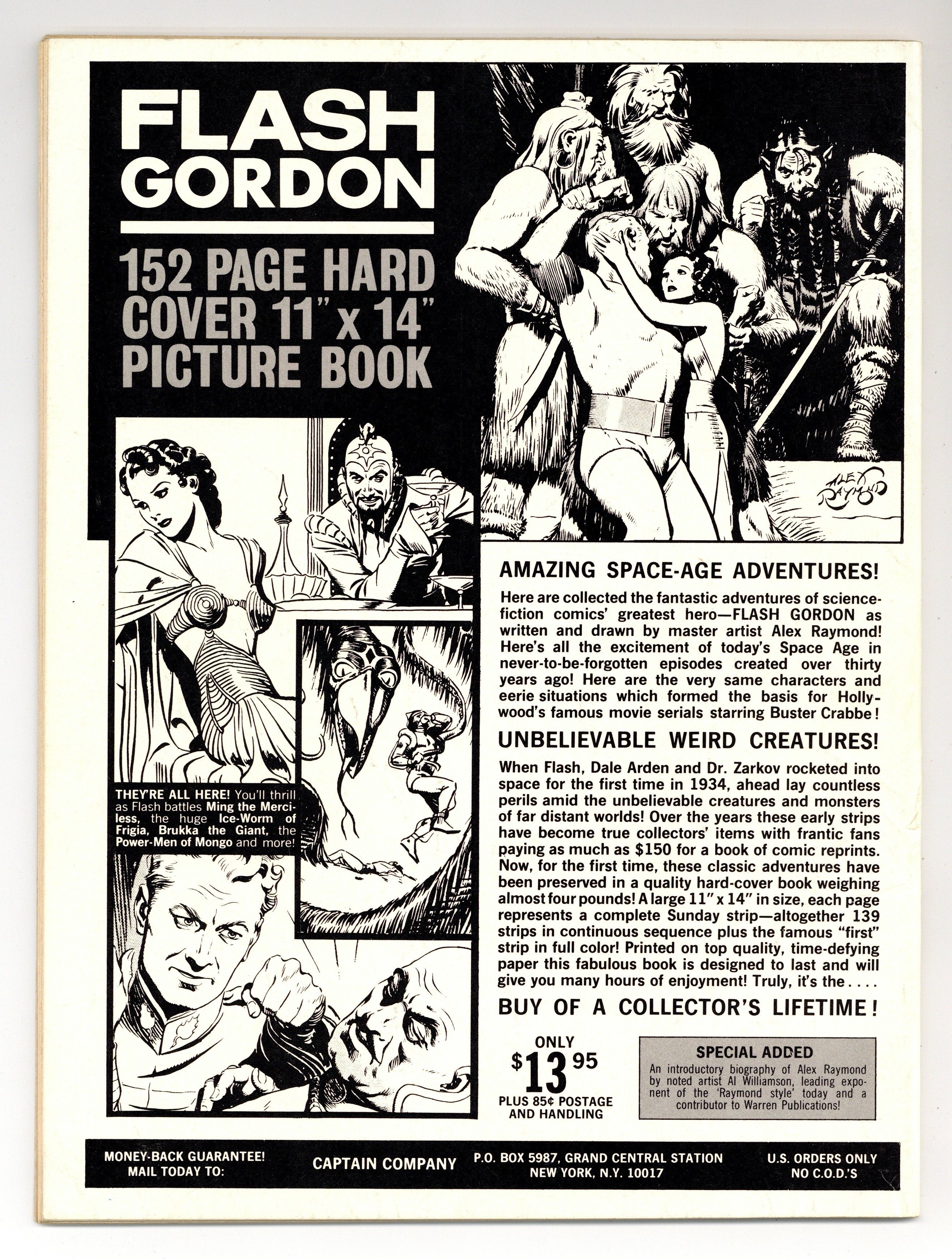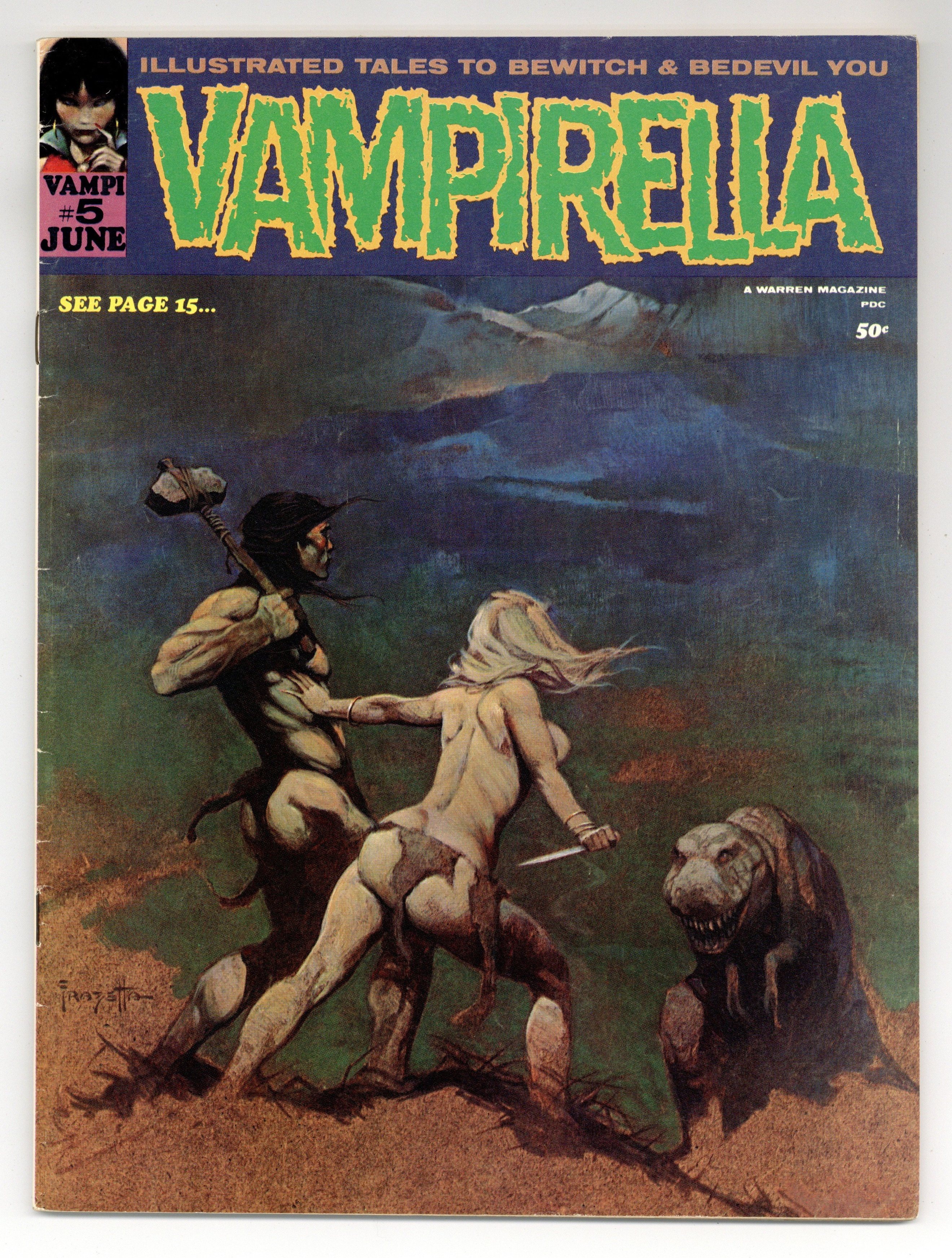 $100.00Issue #5. May 1970. Stories in this issue include: "The Satanic Sisterhood of Stonehenge"; "Craft of a Cat's Eye"; "Scaly Death"; "An Axe to Grind"; "Avenged by Aurora"; "Ghoul Girl"; "Escape Route"; and "Luna." Features new name for fan club page: "Vampi's Flames." Written by T. Casey Brennan, Nicola Cuti, Don Glut, Al Hewetson, and Bill Parente. Art by Billy Graham, John Fantucchio, Jeff Jones, and Mike Royer. Cover art by Frank Frazetta. 8.25" x 11". 64 pages. Black and white. Cover price $0.50.