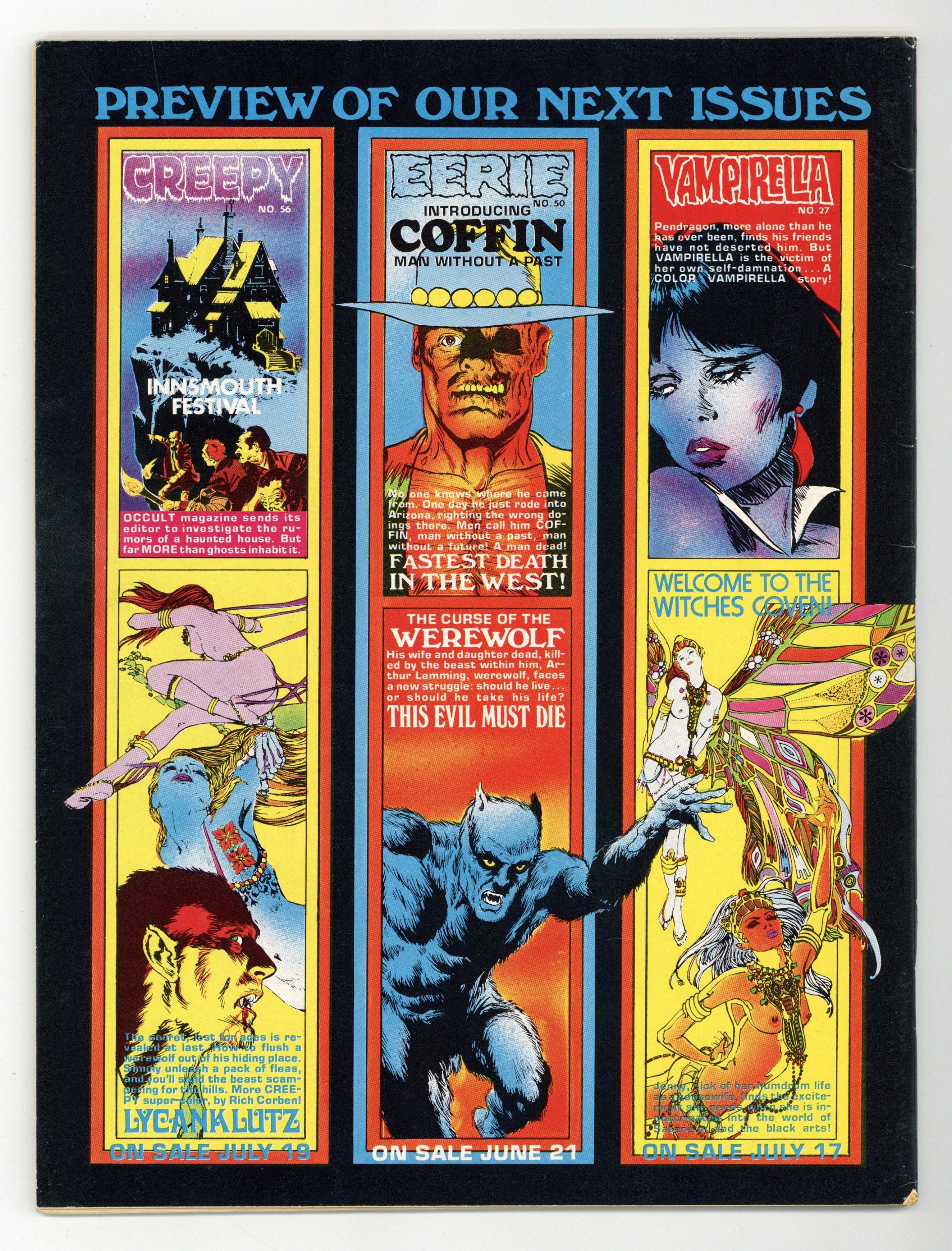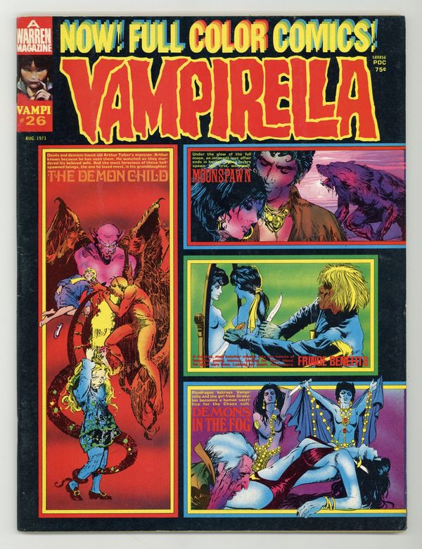 Stories in this issue include: "Demons in the Fog" (starring Vampirella); "Moonspawn" (the story of the first werewolf); "Fringe Benefits" (in full color); "Demon Blood"; and "Blood Brothers." Written by James Crawford, George Henderson, Lynn Marron, Doug Moench, and Len Wein. Art by Auraleon, Jose Bea, Escolano, Jose Gonzalez, Esteban Maroto, Munes, and Ramon Torrents. Cover art by Jose Gonzalez, Esteban Maroto, Jose Bea, and Ramon Torrents. Cover price $0.75.