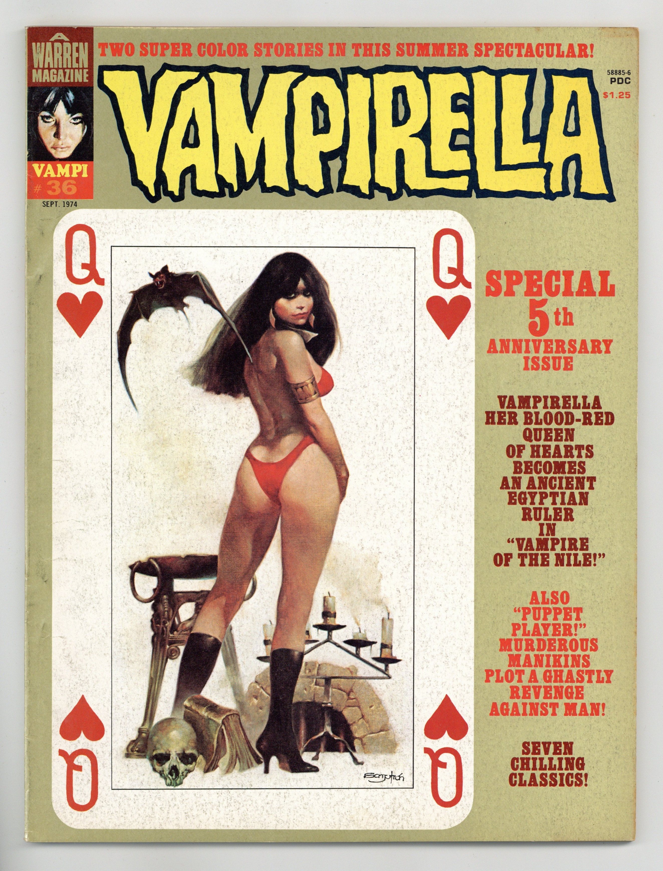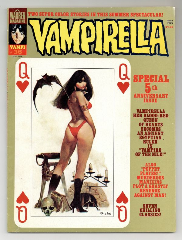 Stories in this special Fifth Anniversary issue include: "Vampire of the Nile" (starring Vampirella); "A Wonderful Morning" (in full color); "The Tiera of Dagon"; "Good to the Last Drop"; "Swordplay"; "Prey for Me"; and "Puppet-Player" (in full color). Written by Jose Bea, Fernando Fernandez, John Jacobson, Flaxman Loew, Rich Margopoulos, and Martin Pasko. Art by Auraleon, Joe Bea, Fernando Fernandez, Jose Gonzalez, Felix Mas, Esteban Maroto, Jose Ortiz, and Ramon Torrents. Cover art by Manuel Sanjulian. Back cover art by Enrich Torres. Cover price $1.25.