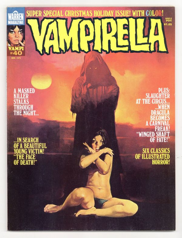 $18.00Stories in this Special Christmas Holiday Issue include: "The Nameless Ravisher" (starring Vampirella); "Winged Shaft of Fate" (in full color); "The Face of Death"; "The Man Who Never Was"; "The Time Eater"; and "Home for the Holidays." Written by Gerry Boudreau, Jack Butterworth, Fernando Fernandez, Budd Lewis, Flaxman Loew, and Carl Wessler. Art by Luis Bermejo, Jose Gonzalez, Fernando Fernandez, Esteban Maroto, Paul Neary, Leopold Sanchez, and Ramon Torrents. "Vampi's Vault" has a feature on Berni Wrightson. Cover art by Enrich Torres. Back cover art by Ken Kelly. Cover price $1.25.