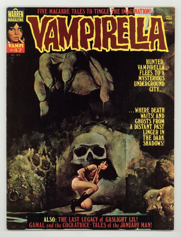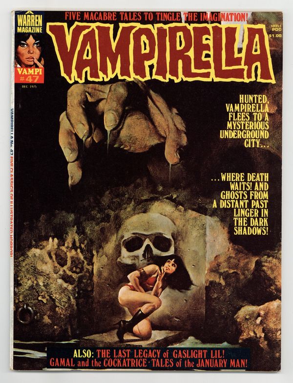 $11.25Stories in this issue include: "Mother's Coming Home" (starring Vampirella); "Legacy of Gaslight Lil" (featuring a brothel on the edge of the Mohave Desert); "Children of Wrath"; "Gamal & the Cockatrice"; and "The January Man." Written by Bruce Bezaire, Gerry Boudreau, and Bill DuBay. Art by Auraleon, Luis Bermejo, Jose Garcia, Gonzalo Mayo, and Ramon Torrents. Includes ad for Hammer Vampirella film that was never produced. Cover art by Enrich Torres. Cover price $1.00.