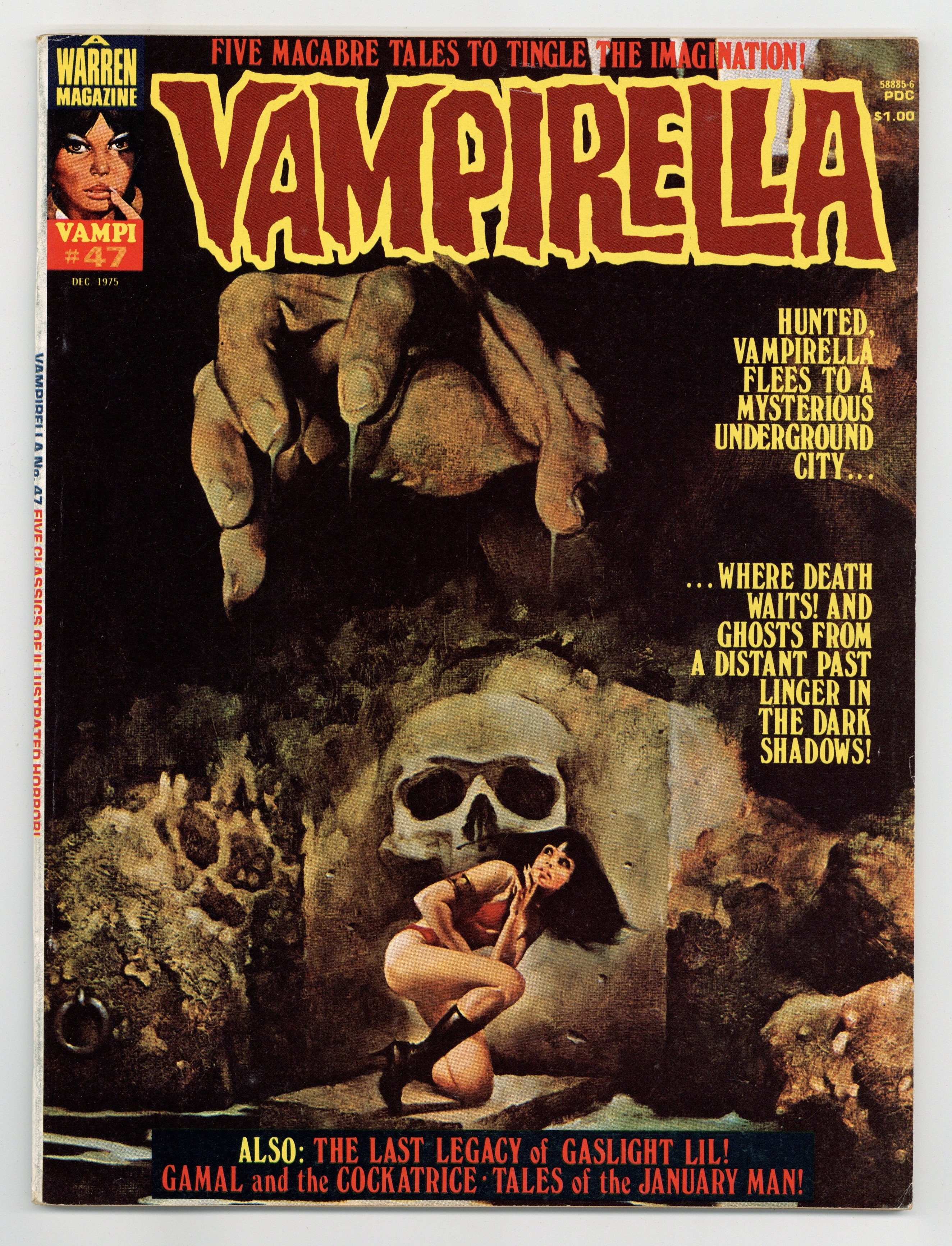 Stories in this issue include: "Mother's Coming Home" (starring Vampirella); "Legacy of Gaslight Lil" (featuring a brothel on the edge of the Mohave Desert); "Children of Wrath"; "Gamal & the Cockatrice"; and "The January Man." Written by Bruce Bezaire, Gerry Boudreau, and Bill DuBay. Art by Auraleon, Luis Bermejo, Jose Garcia, Gonzalo Mayo, and Ramon Torrents. Includes ad for Hammer Vampirella film that was never produced. Cover art by Enrich Torres. Cover price $1.00.
