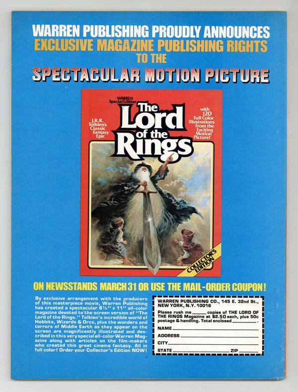 Stories in this issue include: "Kiss the Dragon Queen" (starring Vampirella); "Little Guy"; "Passion" (with the French Foreign Legion); "The Service"; and "Zooner or Later." Written by Cary Bates, Bill DuBay, Steve Englehart, and Bruce Jones. Art by Alfredo Alcala, Auraleon, Russ Heath, Ganzalo Mayo, Jose Ortiz, and Jim Starlin. Joe Brancatelli's comic books column is about the Superman craze. Fan Page features a contest in which fans design a new Vampi costume. Cover photo is of Barbara Leigh as Vampi. Cover price $1.50.